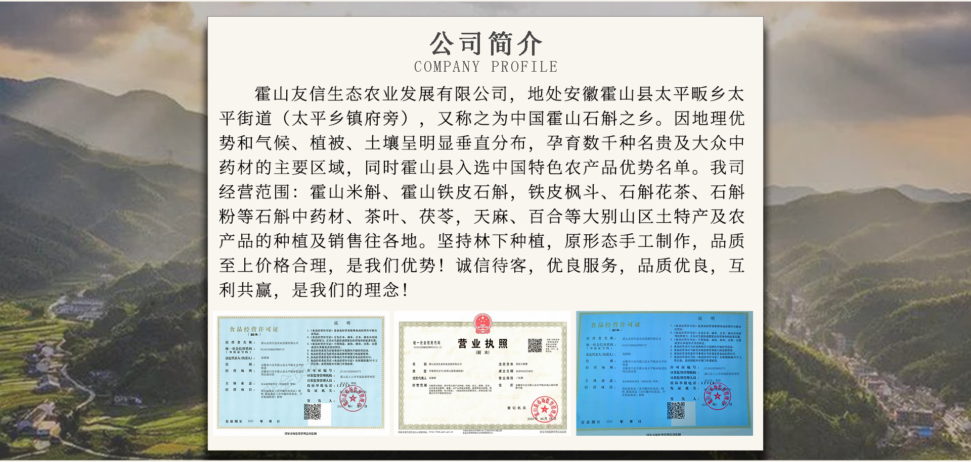 霍山友信生态农业发展有限公司是一家从事大别山区霍山县的中草药材的企业,主营霍山石斛,霍山黄牙,黄精,灵芝,天麻,茯苓,艾叶等。