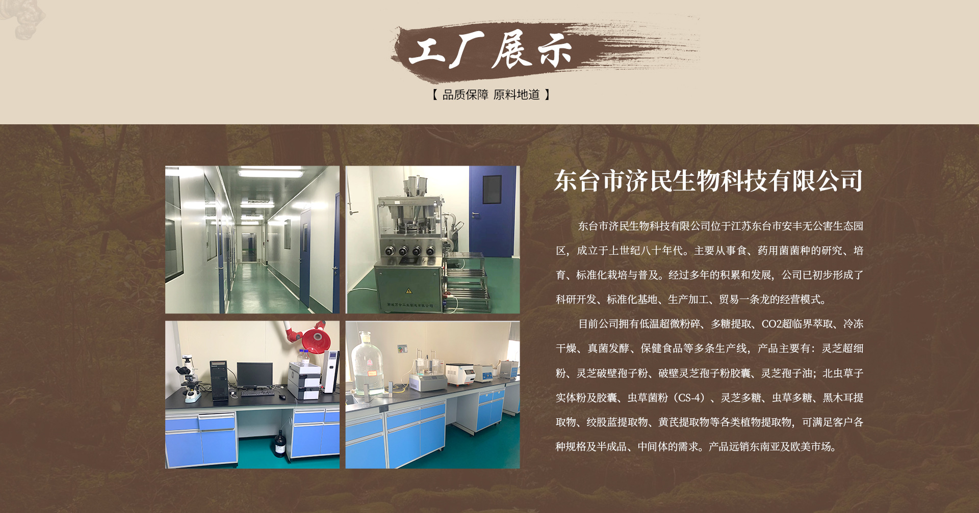 东台市济民生物科技有限公司位于江苏东台市安丰无公害生态园区,成立于上世纪八十年代。主要从事食、药用菌菌种的研究、培育、标准化栽培与普及。经过多年的积累和发展,公司已初步形成了科研开发、标准化基地、生产加工、贸易一条龙的经营模式。 目前公司拥有低温超微粉碎、多糖提取、CO2超临界萃取、冷冻干燥、真菌发酵、保健食品等多条生产线,产品主要有:灵芝超细粉、灵芝破壁孢子粉、破壁灵芝孢子粉胶囊、灵芝孢子油;北虫草子实体粉及胶囊、虫草菌粉(CS-4)、灵芝多糖、虫草多糖、黑木耳提取物、绞股蓝提取物、黄芪提取物等各类植物提取物,可满足客户各种规格及半成品、中间体的需求。产品远销东南亚及欧美市场。