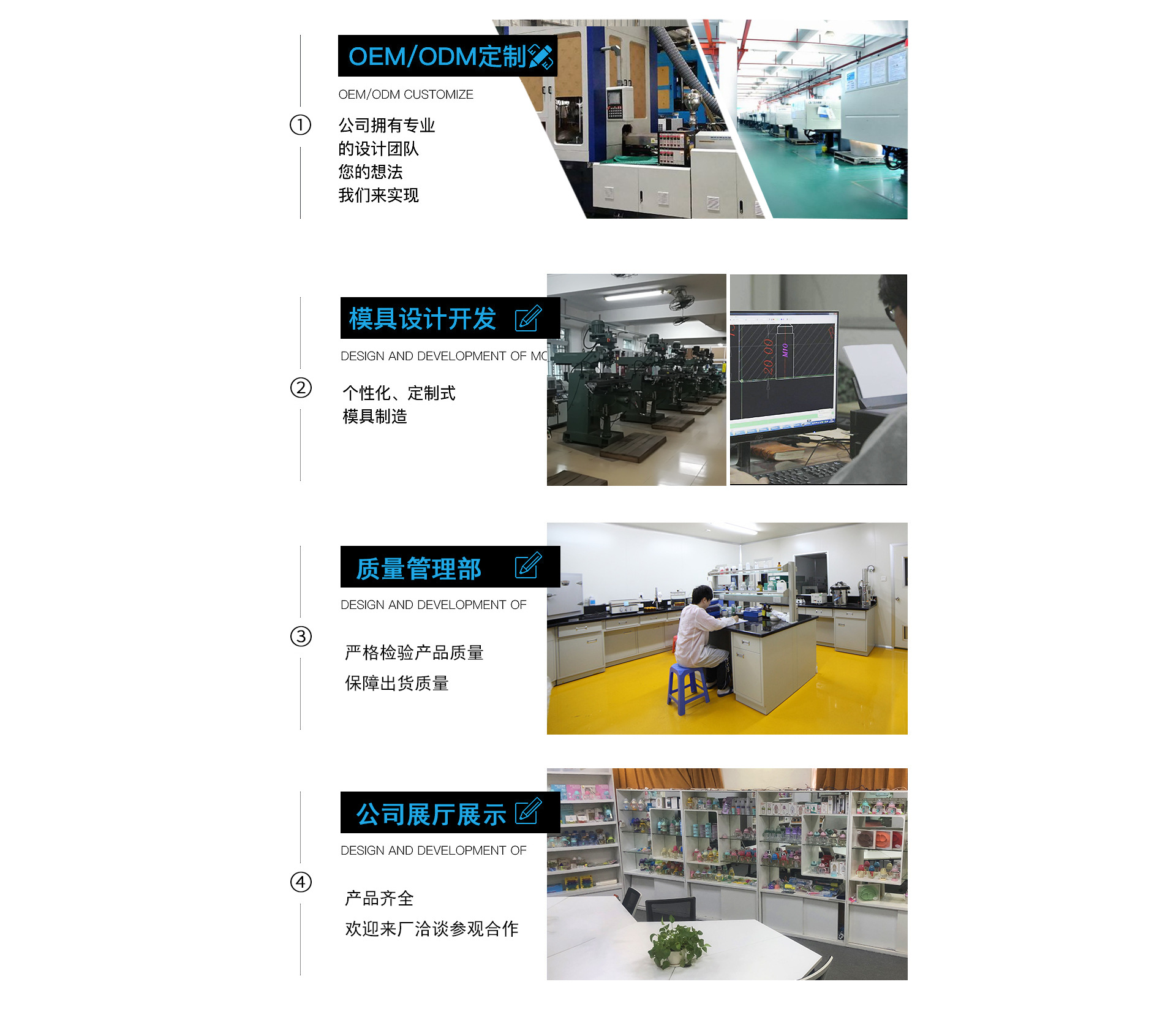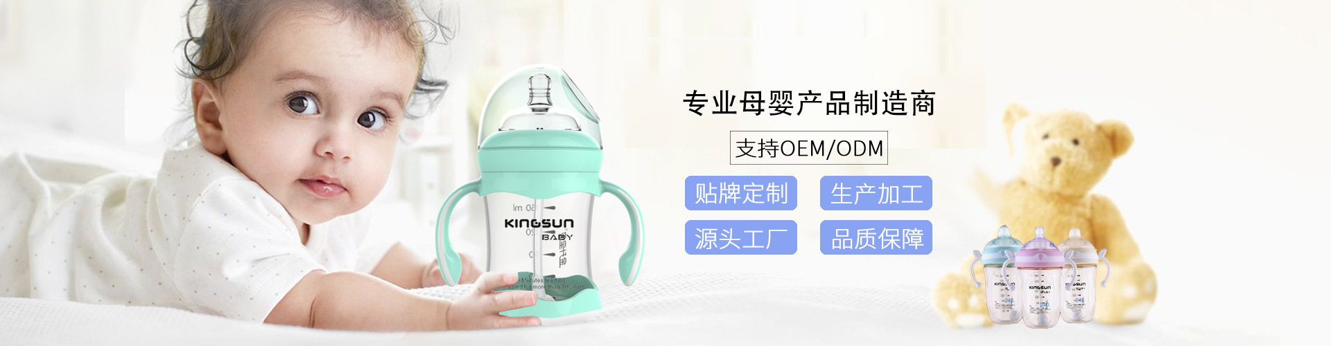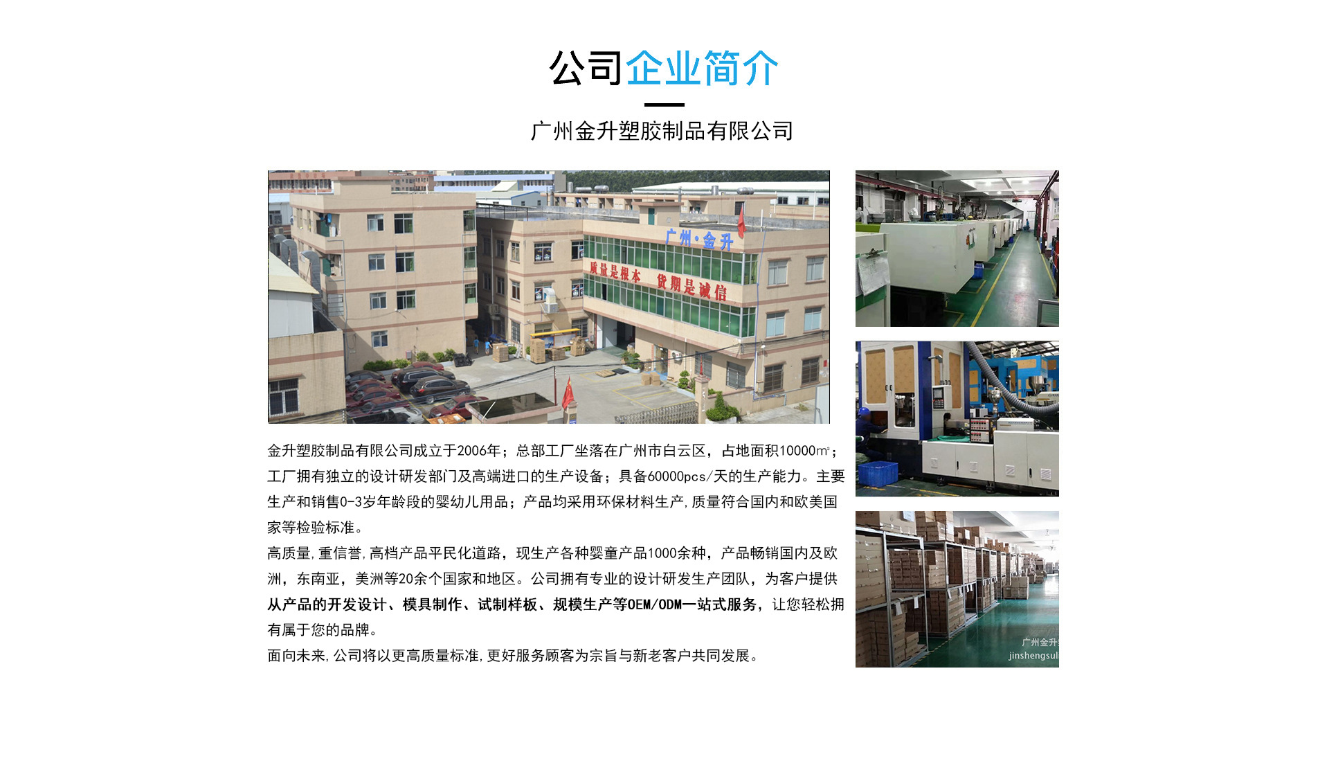 广州金升塑胶制品有限公司 金升塑胶制品有限公司成立于2006年; 总部工厂坐落在广州市白云区人和镇东华工业区同贵路8号A2园区,占地面积10000㎡; 工厂拥有行业内领先的设计研发部门及一流的生产设备;具备60000pcs/天的生产能力。 主要生产和销售0-3岁年龄段的婴幼儿用品; 包括:婴儿奶瓶系列、奶嘴系列、餐具系列、杯壶系列、健康护理清洁系列、母婴安全生活用品系列等; 产品均采用环保材料生产,质量符合国内和欧美国家等检验标准。 高质量,重信誉,高档产品平民化道路,现生产各种婴童产品1000余种,产品畅销国内及欧洲,东南亚,美洲等20余个国家和地区。 公司拥有专业的设计研发生产团队,为客户提供从产品的开发设计、模具制作、试制样板、规模生产等OEM/ODM一站式服务。