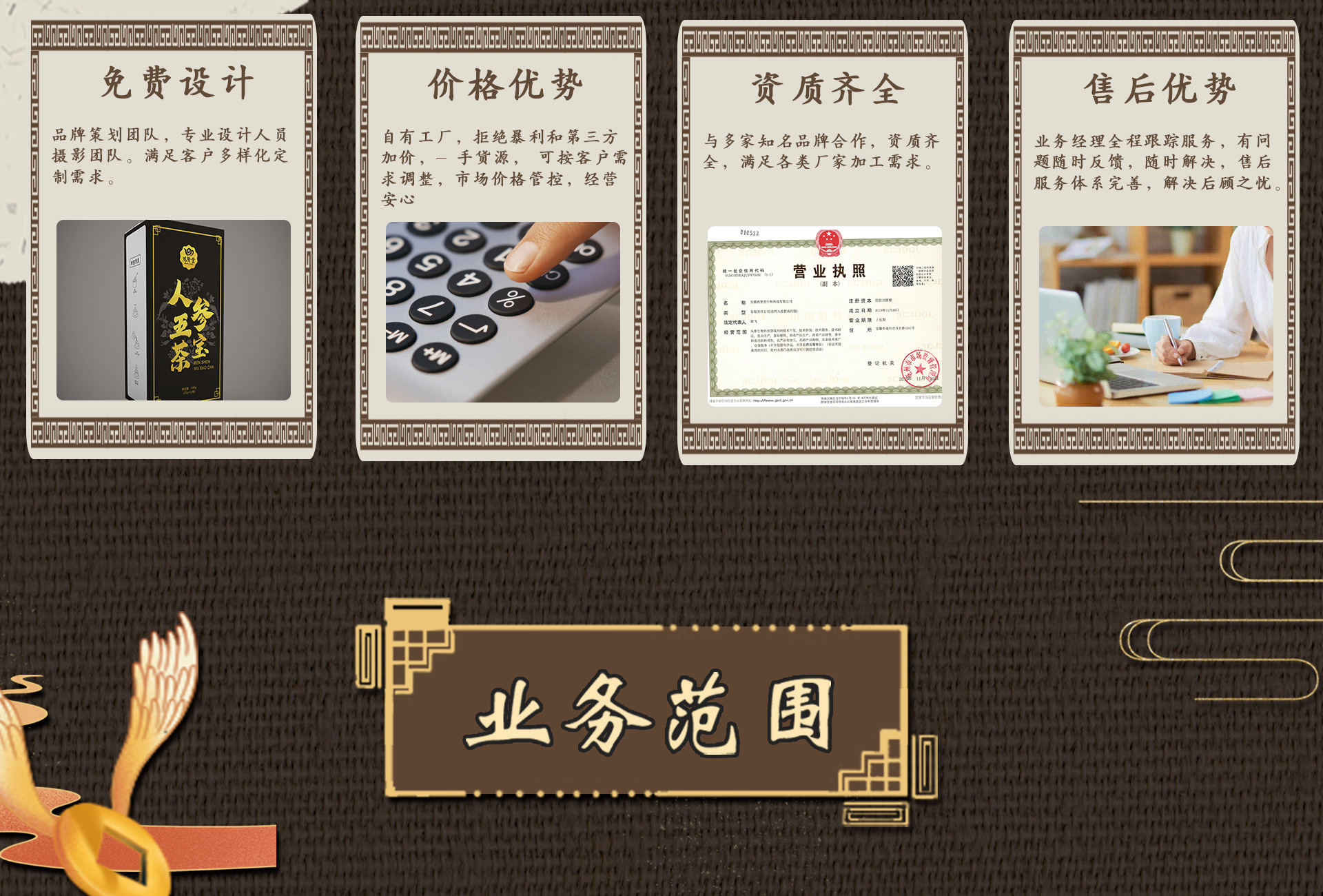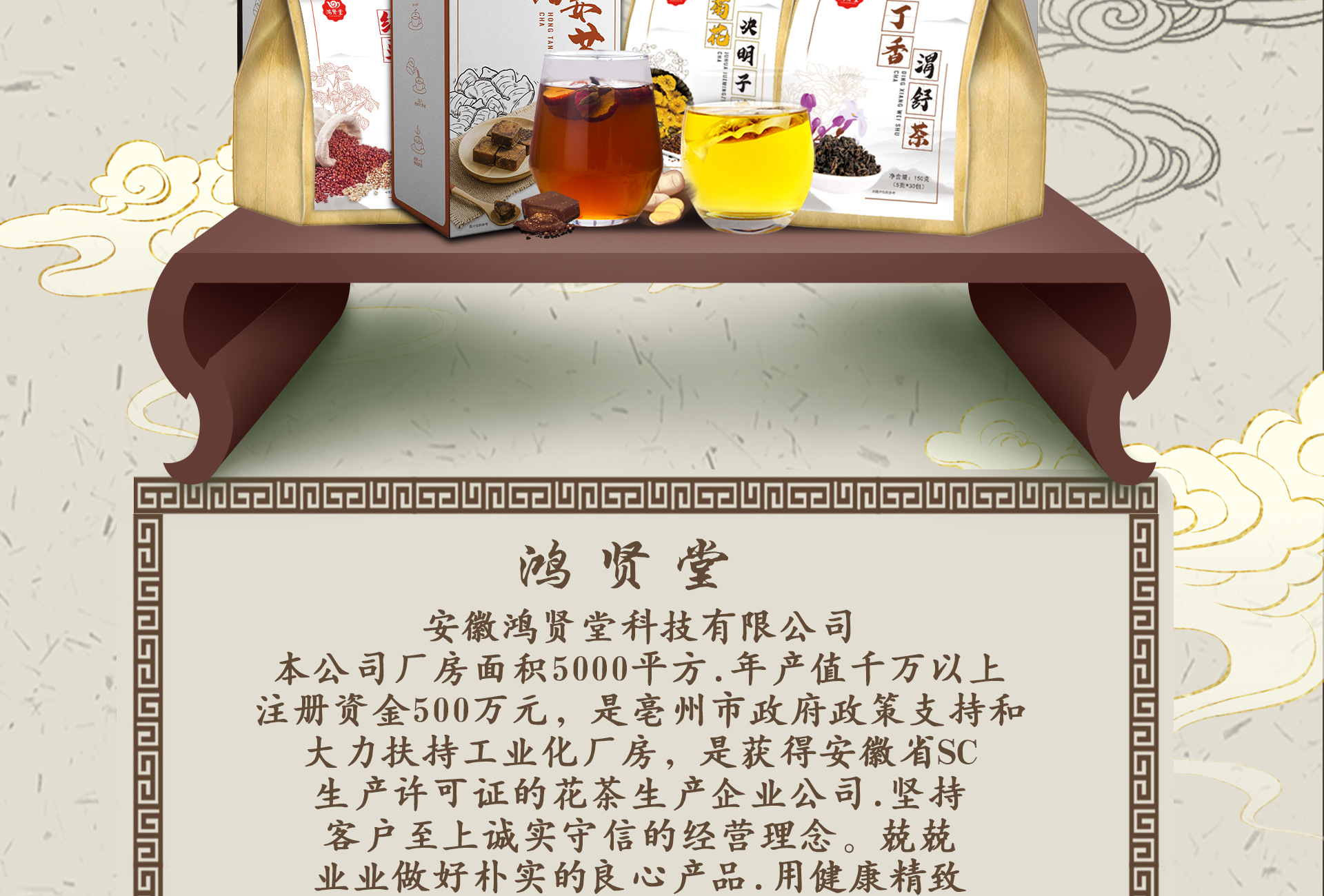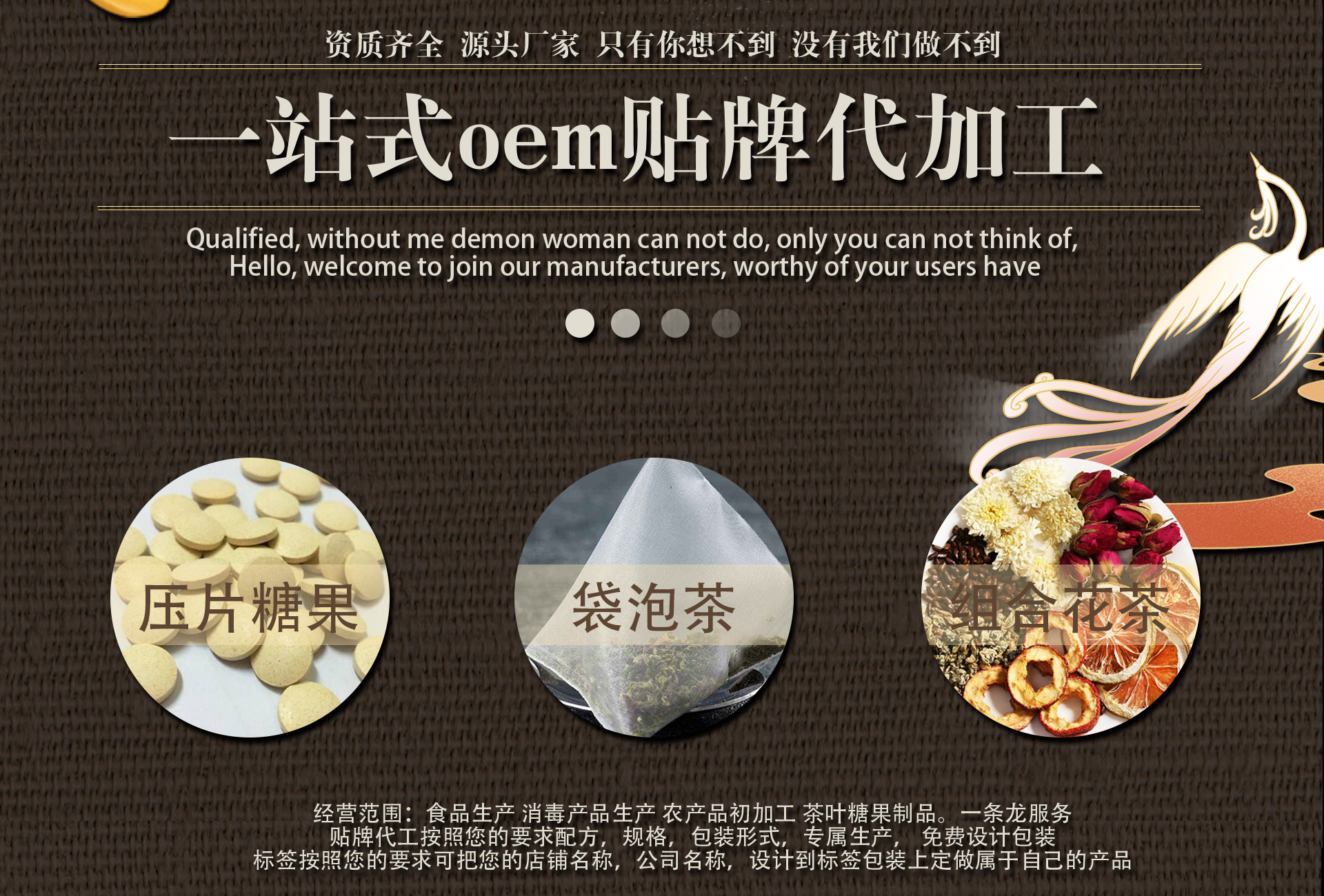 安徽鸿贤堂生物科技有限公司 公司拥有罐装花茶、袋泡茶、三角包、组合花茶、调味茶、压片糖果,养生茶研究实验室、专业包装设计团队。可以一条龙为您提供 功效配方实验、袋泡茶加工、代用茶加工、压片糖果包装设计等服务。 ============================= 我公司可生产单囊袋泡茶、内外袋高档袋泡茶、双囊袋泡茶、三角包袋泡茶等。 ============================= 所加工产品可提供SC生产许可证)、执行标准、可备案产品包装,让您只需要安心销售,产品的一切交给我们! ============================= 为给更多的企业提供更加方便的服务,并协助办理..