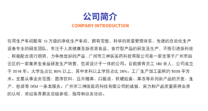 广州市三神医生物科技有限公司是保健品、原料等产品专业生产加工的公司,拥有完整、科学的质量管理体系。广州市三神医生物科技有限公司的诚信、实力和产品质量获得业界的认可。欢迎各界朋友莅临参观、指导和业务洽谈。
