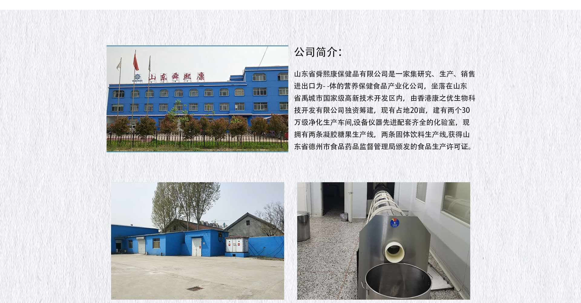 山东省舜熙康保健品有限公司是一家集研究、生产、销售、进出口为一体的营养保健食品产业化公司,坐落在山东省禹城市国家级高新技术开发区内,由香港康之优生物科技开发有限公司独资筹建,现有占地20亩,建有两个30万级净化生产车间,设备仪器先进配套齐全的化验室,现拥有两条凝胶糖果生产线,两条固体饮料生产线,获得山东省德州市食品药品监督管理局颁发的食品生产许可证。 公司现有员工120余人,其中专业技术人员50余人,专业质检化验人员20余人。现有凝胶糖果,固体饮料两大系列。公司秉承质量保障,信誉保障,坚持做到诚信品质,健康未来。