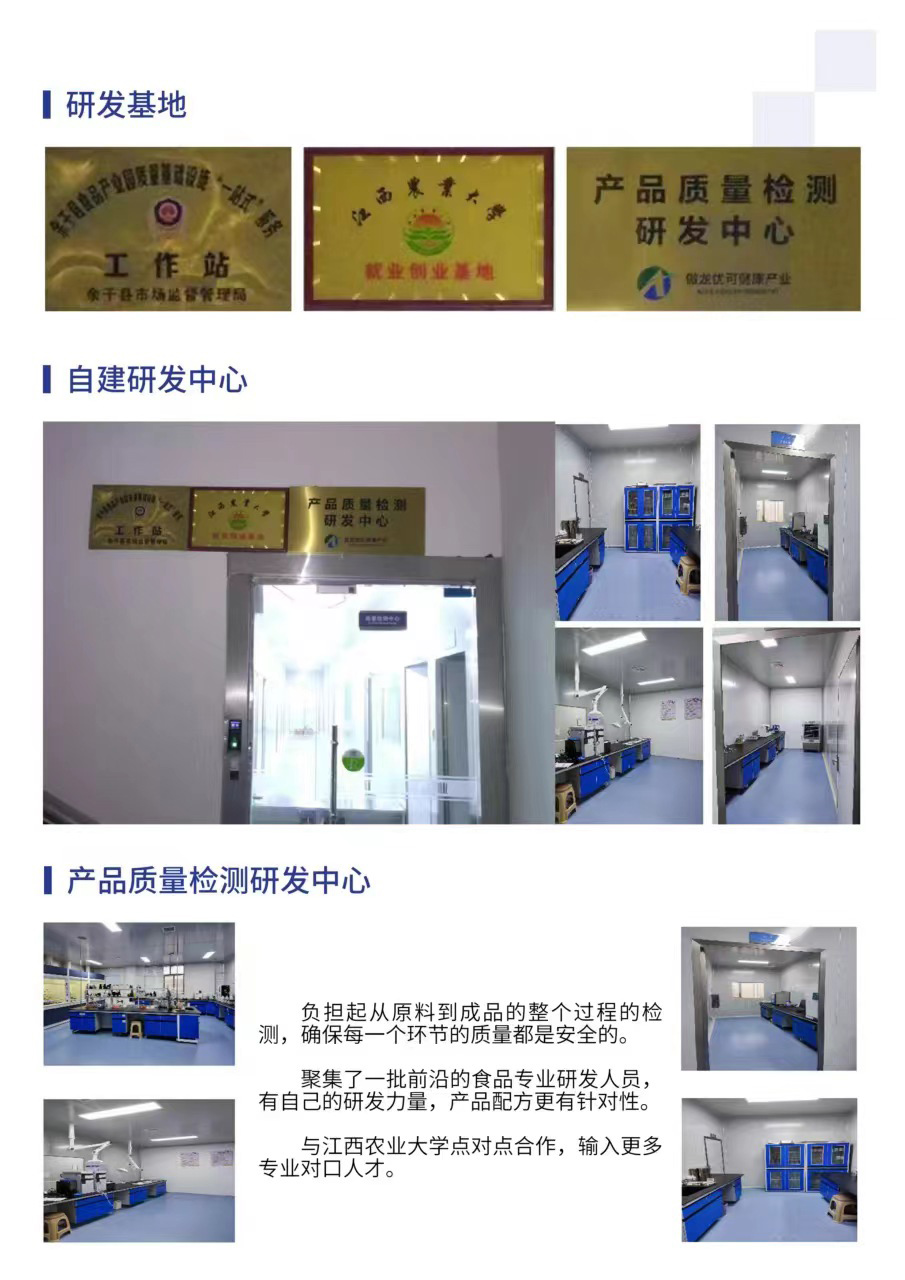 江西傲龙优可健康产业有限公司,位于上饶市余干县乌泥镇余干生态食品产业园,占地面积28余亩,现有员工300余人,拥有十万级净化车间6000平方米,江西傲龙优可健康产业有限公司拥有自主生产线以及研发基地和现代化厂房设备,严格按照GMP标准进行设计、建造和管理,并已通过国家GMP和国家质量安全SC双重认证,是一家现代化、标准化、规模化企业。