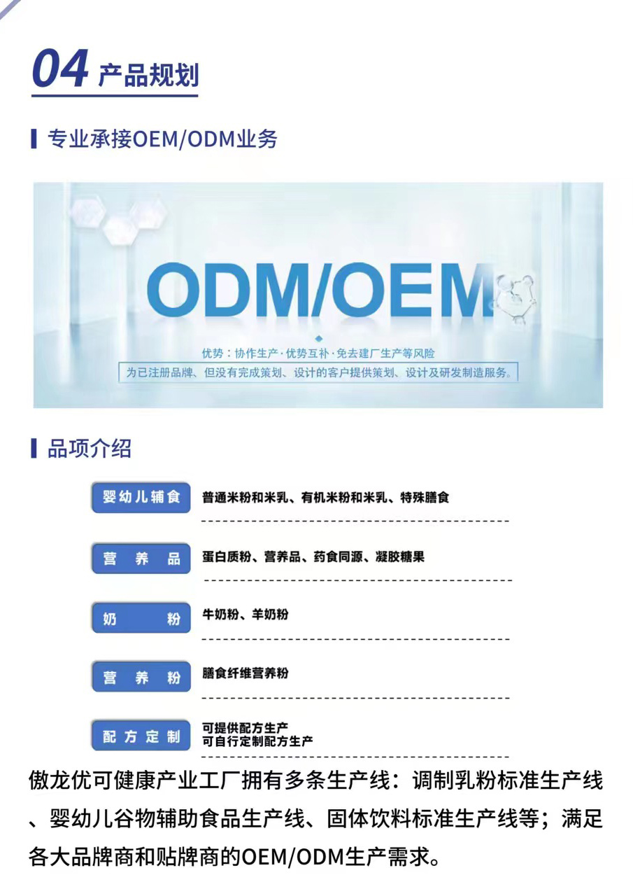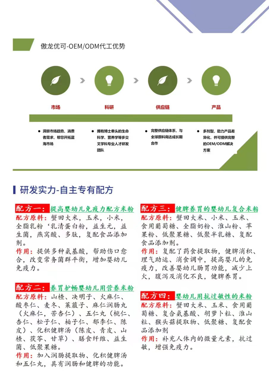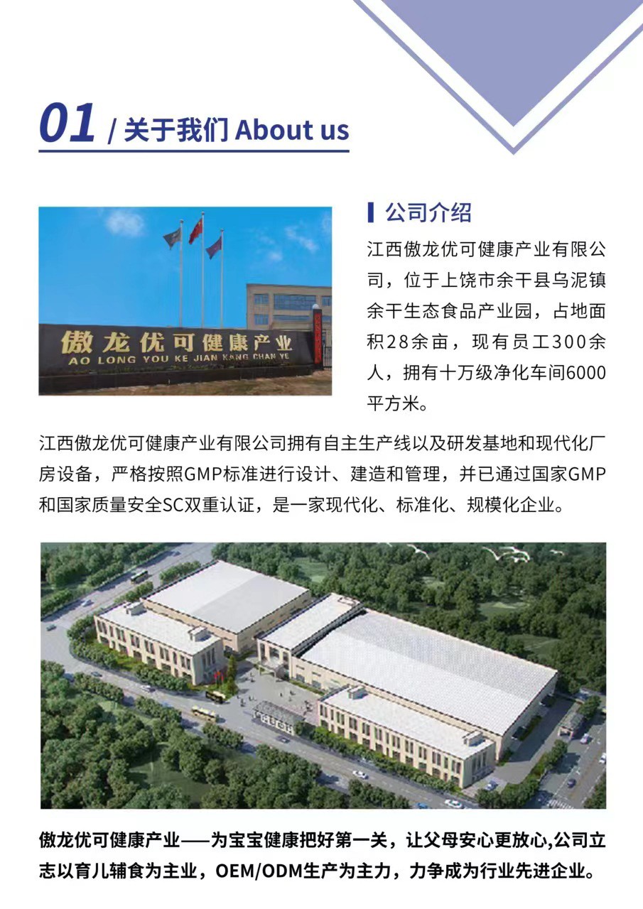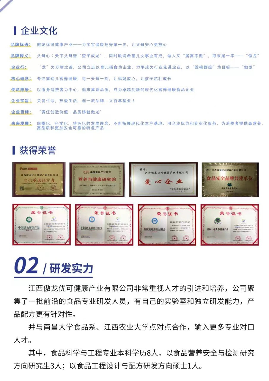以“营养健康为专家”的理念为引领,江西傲龙优可健康产业主要以研发和生产婴幼儿辅助食品、奶粉为根本,所生产的婴幼儿辅助食品参照中国营养学会推荐的婴幼儿营养需求量等营养科学技术标准,以当代婴幼儿的生理特征及饮食习惯为研究方向,采用优质有机大米、全脂奶粉、低聚果糖、低聚半乳糖、多种维生素及矿物质研制出了独有的健康营养辅食。