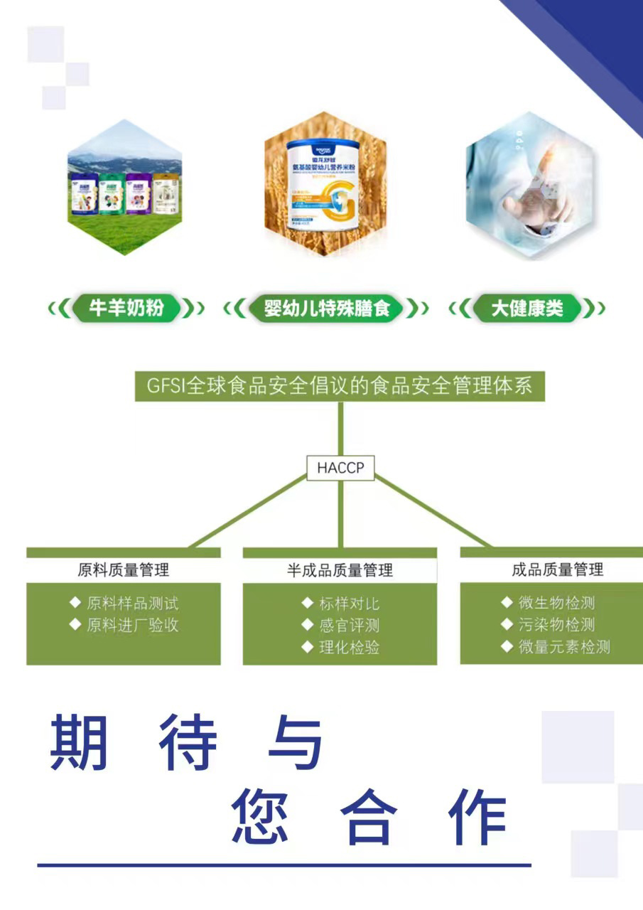 确保为婴幼儿提供安全、质优的产品,一直都是江西傲龙优可健康产业有限公司生产时的重中之重。为此,江西傲龙优可健康产业有限公司奉行及其严格的供应商审核和原材料检验制度,从源头上保证所采用的原材料新鲜和安全。能够做到这一点,江西傲龙优可健康产业有限公司所拥有的先进的生产设备和技术也功不可没。这些设备可以检测出百万分之一、甚至亿万分之一的微量有害物质,确保产品安全,江西傲龙优可健康产业有限公司所采用的HACCP质量控制程序,可以控制生产过程中所有与产品质量相关的关键点,确保品质安全可靠。
