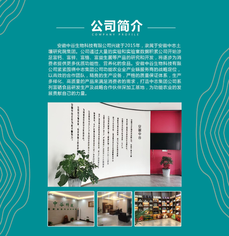 中国系列富硒食品生产基地,安徽中谷生物科技有限公司兴建于2015年,隶属于安徽中志土壤研究院集团。公司目前产品主要分为五大类:   一、富硒农副产品系列,涵盖富硒米、面、杂粮及深加工产品多达100多个品种。   二、富硒瓜果蔬菜制品,   三、富硒系列白酒、富硒系列红酒、富硒系列石榴酒、富硒系列果醋、富硒系列饮料、富硒水等    四、富硒化妆品系列产品   五、富硒水产、家禽系列制品   六、富硒木耳、花茶、茶叶等系列产品多达30多个品种。   通过大量的实验和实验室数据积累公司开始涉足富钙、富锌、富铬、富益生菌等产品的研究和开发,将逐步为消费者提供更多优质功能性、营养化的食品。   安徽中谷生物科技有限公司位于安徽省人民政府批准设立的省级开发区,组建于2003年。   安徽中谷生物科技有限公司紧紧围绕中志集团公司功能农业全产业链服务商的战略定位,以高效的合作团队,精良的生产设备