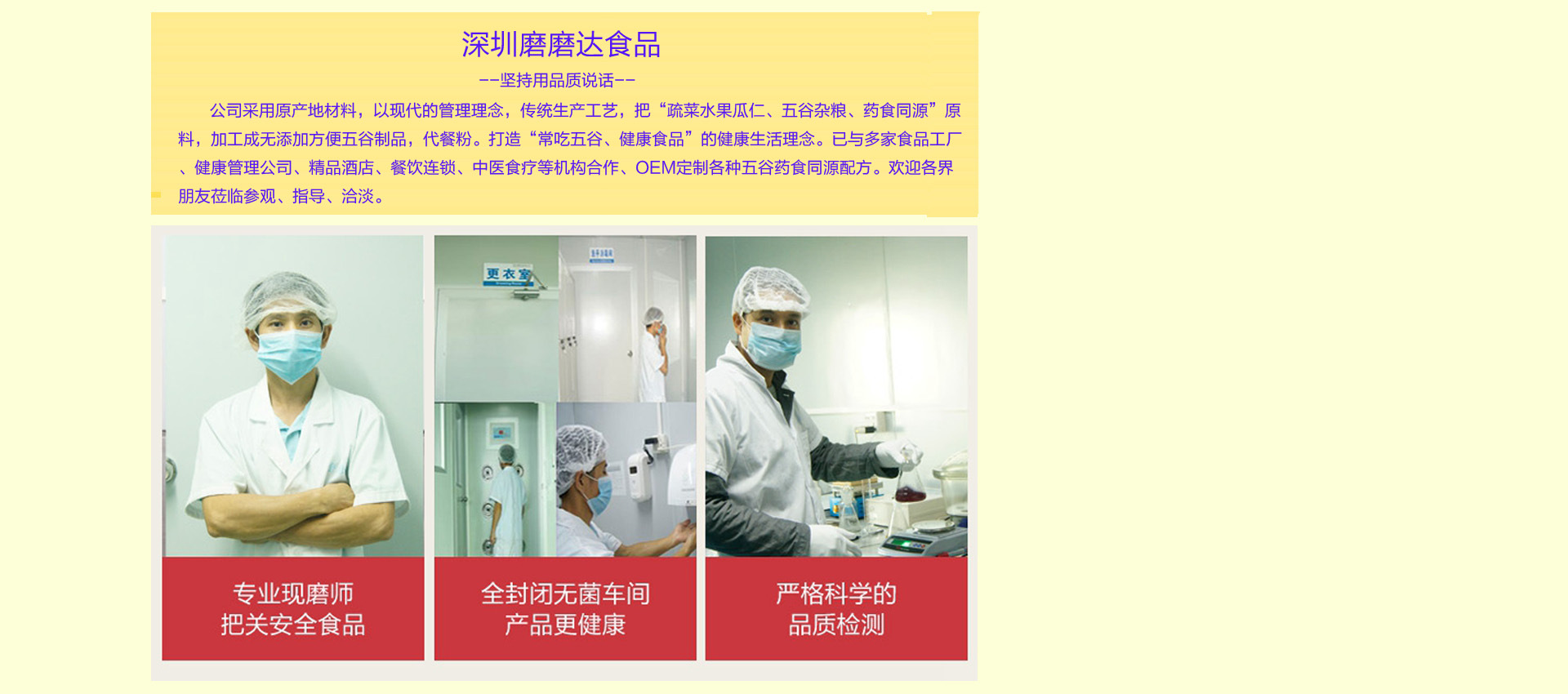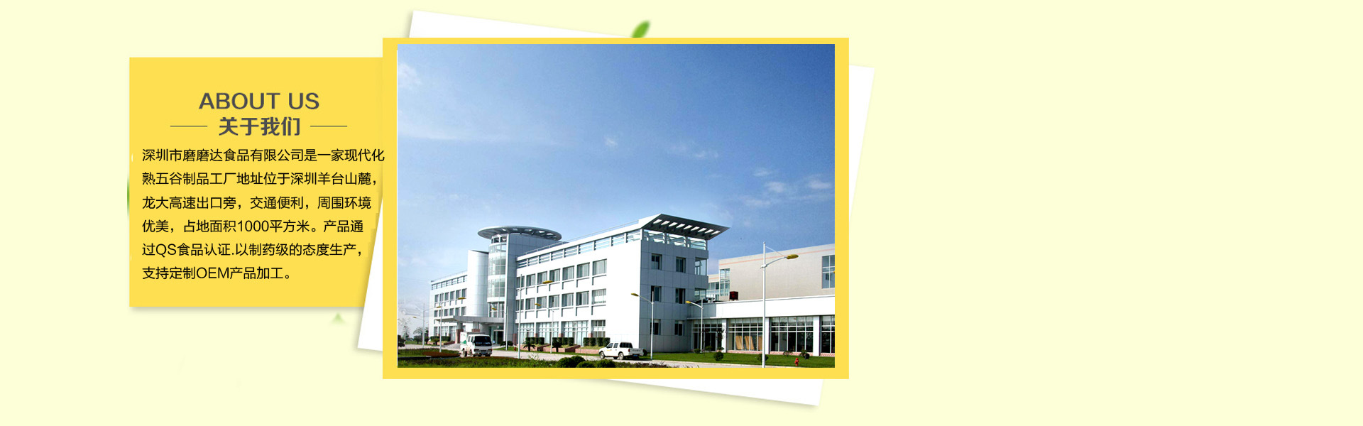 深圳市磨磨达食品有限公司是一家现代化现磨五谷杂粮养生粉的工厂,经SC认证,以制药级的态度生产现磨,精益求精,确保食品安全。公司的诚信、实力和产品质量获得业界的认可。欢迎各界朋友莅临参观、指导和业务洽谈。
