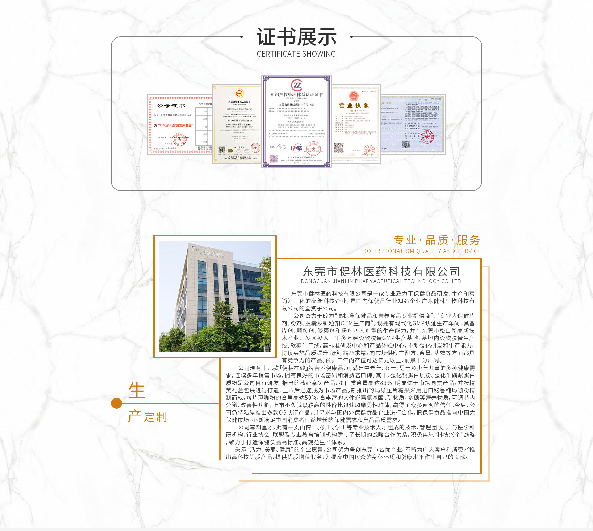健林公司分别在东莞市松山湖高新科技产业开发区和雅园工业区拥有生产基地,配备10万级GMP洁净车间和世界先进的固体制剂加工设备。公司拥有现代化GMP认证生产车间和世界先进生产设备,具备片剂、颗粒剂、胶囊、软胶囊和粉剂五大剂型的生产能力,可年产片剂10亿片、胶囊3亿粒、粉剂600吨。