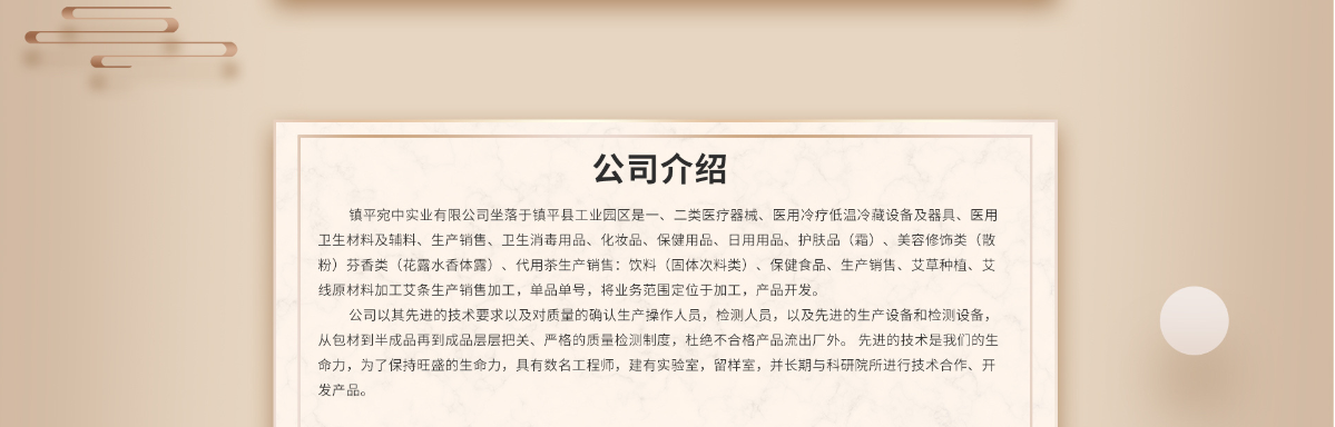企业简介 河南宛中实业有限公司坐落于镇平县工业园区,旗下公司有:向美实业有限公司、鼎达成医疗、万乐堂医药、一聪实业。是专业一、二类医疗器械、医用冷疗低温冷藏设备及器具、医用卫生材料及辅料、生产销售、卫生消毒用品、化妆品、保健用品、日用用品、护肤品(霜)、美容修饰类(散粉)芬香类(花露水香体露)、代用茶生产销售:饮料(固体次料类)、保健食品、生产销售、艾草种植、艾线原材料加工艾条生产销售加工,单品单号,始终将业务范围定位于专业加工,专业产品开发。公司以其先进的技术要求以及对质量的保证拥有专业的生产操作人员,优秀的检测人员,以及先进的生产设备和检测设备,从包材到半成品再到成品层层把关、严格的质量检测制度,杜绝不合格产品流出厂外。 先进的技术是我们的生命力,为了保持旺盛的生命力,具有数名资深工程师,建有专业的实验室,留样室,并长期与著名的科研院所进行技术合作、开发先进