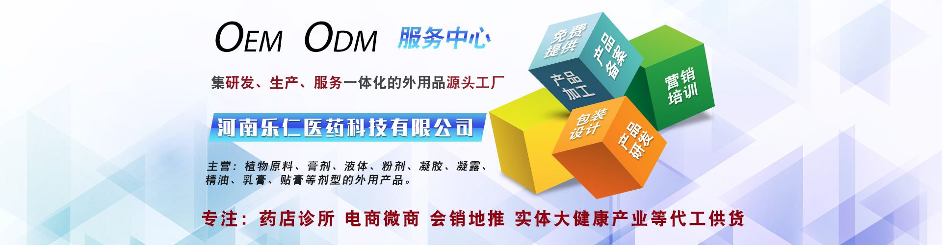 河南乐仁医药科技有限公司是一家集研发、生产、销售贴牌OEM代加工的功效型健字号和功效型消字号产品生产企业。工厂座落于古都洛阳,拥有GMP认证的十万级净化无菌车间,主要生产膏剂、液体、粉剂、凝胶、凝露、精油、乳膏、贴膏等剂型的外用产品。