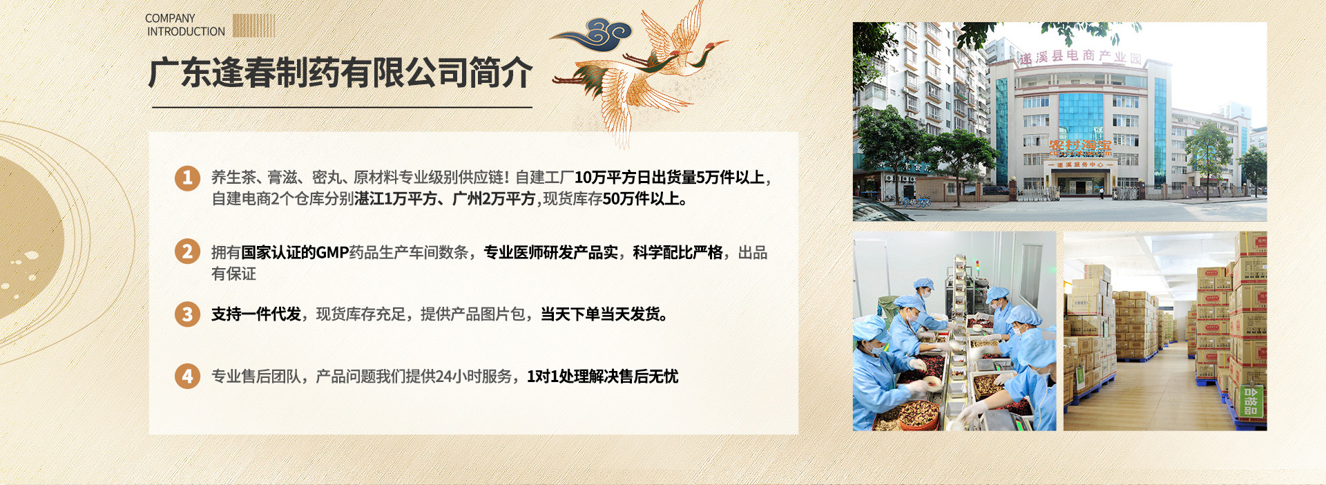 拥有自己的GMP工厂,广东逢春制药有限公司,能够生产譬如养生茶,膏方,丸子,饮料,代餐粉等多种生产大健康类的食品,拥有自主研发团队,滋补行业的五宝茶配方就是我公司首创并一直是这个细分类目的第一,年销售200万盒,另外我公司还首创了滋补行业的小爆款治疗失眠的酸枣仁膏,治疗咳嗽的化橘红膏,祛湿的红豆薏米丸等。健康无添加,滋补零食化,便捷化将是福东海品牌未来的发展方向,秉承创新健康的理念持续引领健康滋补行业!
