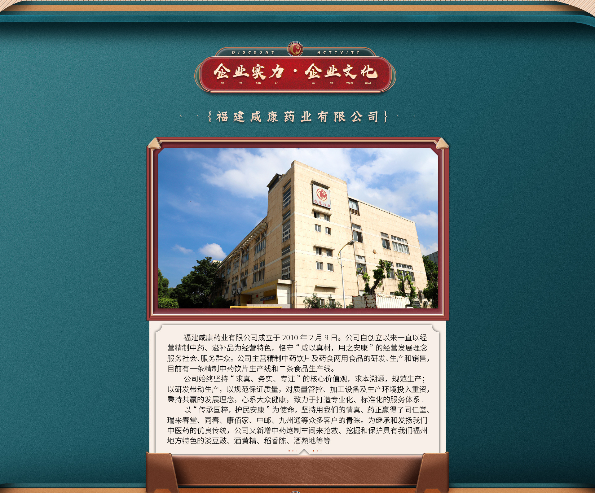 福建咸康药业有限公司成立于2010年2月9日。公司自创 立以来- - -直以经营精制中药、滋补品为经营特色,恪守“咸以真材, 用之安康”的经营发展理念服务社会、服务群众。公司主营精制 中药饮片及药食两用食品的研发、生产和销售,目前有一条精制 中药饮片生产线和二条食品生产线。 公司始终坚持“求真、务实、专注”的核心价值观,求本溯源, 规范生产;以研发带动生产,以规范保证质量,对质量管控、加 工设备及生产环境投入重资,秉持共赢的发展理念,心系大众, 致力于打造专业化、标准化的服务体系. 以“传承国粹,护民安康”为使命,坚持用我们的情真、药 正赢得了同仁堂、瑞来春堂、同春、康佰家、中邮、九州通等众 多客户的青睐。为继承和发扬我们中医药的优良传统,公司又新 增中药炮制车间来抢救、挖掘和保护具有我们福州地方特色的淡 豆豉、酒黄精、稻香陈、酒熟地等等