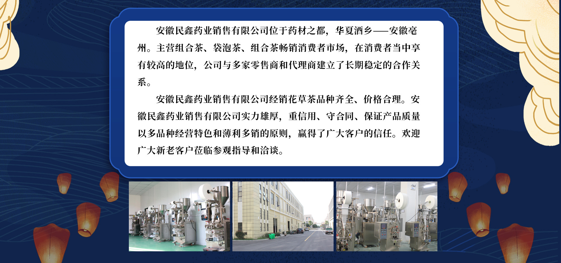 安徽民鑫药业销售有限公司成立于2015年9月、注册资金1000万元、工厂占地3600平方米,现位于安徽省亳州市经济技术开发区高新区蔷薇路。是一家集生产、销售于一体的综合性公司,主要生产经营袋泡茶、组合茶、三角包及糖浆制品,有丰富的定制加工经验,目前支持一件代发、贴牌加工、包工包料、来料加工等多种合作模式。有意向的客户可致电本公司洽谈或者来实地考察