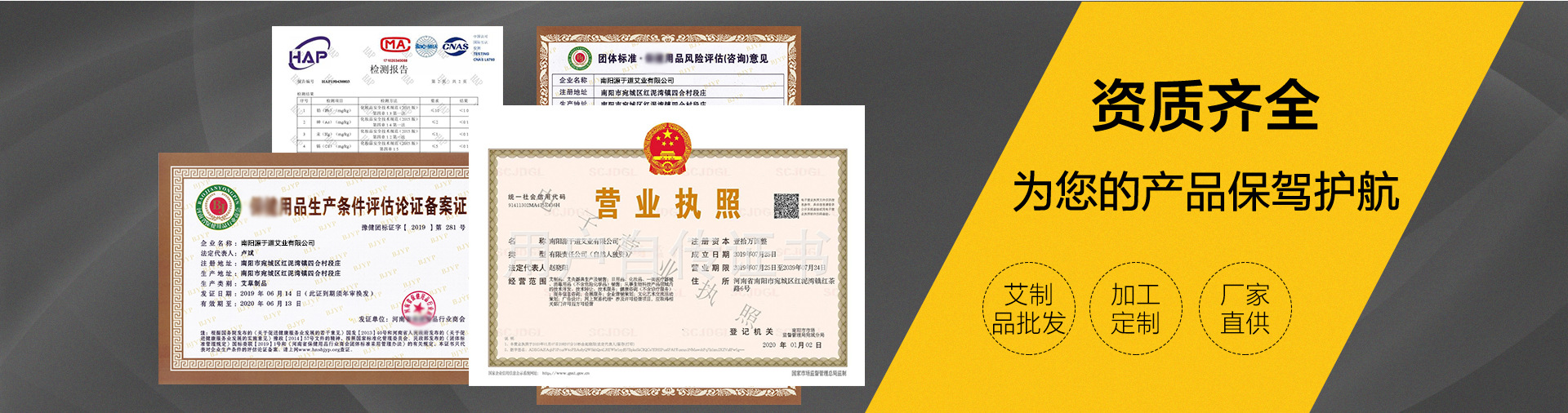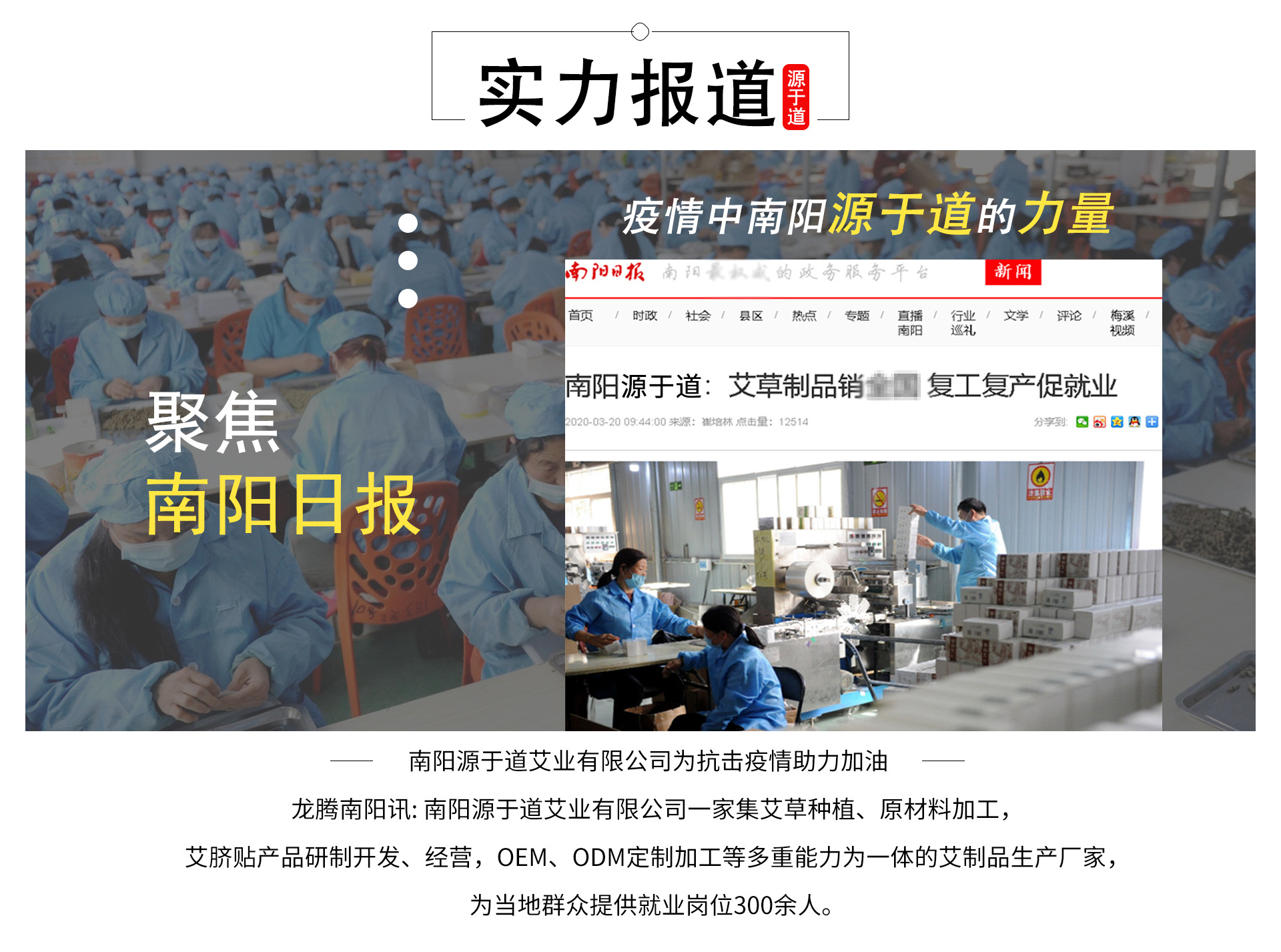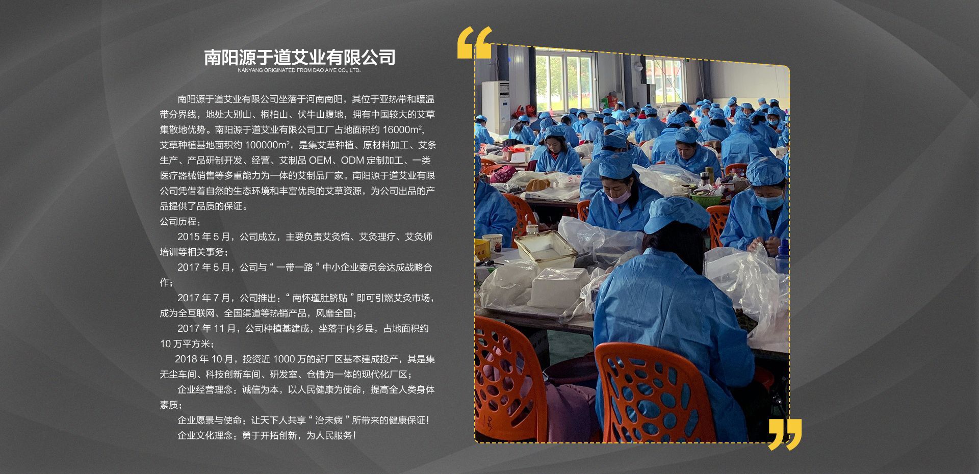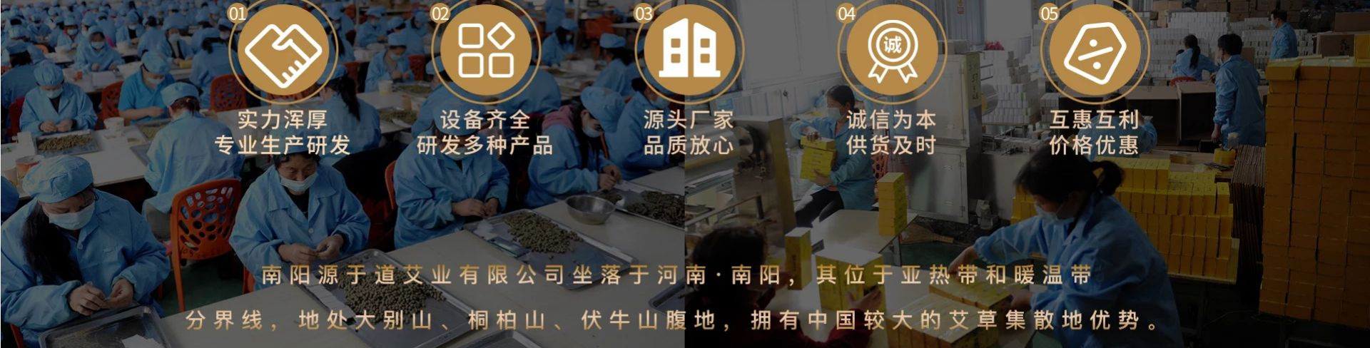 南阳源于道艾业有限公司坐落于河南·南阳,其位于亚热带和暖温带分界线,地处大别山、桐柏山、伏牛山腹地,拥有中国较大的艾草集散地优势。 南阳源于道艾业有限公司工厂占地面积约16000m2,艾草种植基地面积约100000m2,是集艾草种植、原材料加工、艾条生产、产品研制开发、经营、艾制品OEM、ODM定制加工、一类医疗器械销售等多重能力为一体的艾制品厂家。 南阳源于道艾业有限公司凭借着自然的生态环境和丰富的艾草资源,为公司出品的产品提供了良好的保证。 公司历程: 2015年5月,公司成立,主要负责艾灸馆、艾灸理疗、艾灸师培训等相关事务; 2017年5月,公司与“一带一路”中小企业委员会达成战略合作; 2017年7月,公司推出:“南怀瑾肚脐贴”即可引燃艾灸市场,成为全互联网、国内渠道等紧俏产品,风靡各地; 2017年11月,公司种植基建成,坐落于内乡县,占地面积约10万平方米.