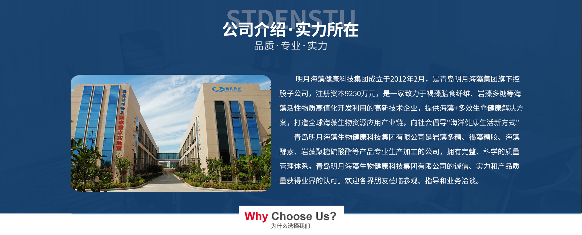 明月海藻健康科技集团成立于2012年2月,是青岛明月海藻集团旗下控股子公司,注册资本9250万元,是一家致力于褐藻膳食纤维、岩藻多糖等海藻活性物质高值化开发利用的高新技术企业,提供海藻+健康解决方案,打造全球海藻生物资源应用产业链,向社会倡导"海洋健康生活新方式"。 青岛明月海藻生物健康科技集团有限公司是岩藻多糖、褐藻糖胶、海藻酵素、岩藻聚糖硫酸酯等产品专业生产加工的公司,拥有完整、科学的质量管理体系。青岛明月海藻生物健康科技集团有限公司的诚信、实力和产品质量获得业界的认可。欢迎各界朋友莅临参观、指导和业务洽谈。