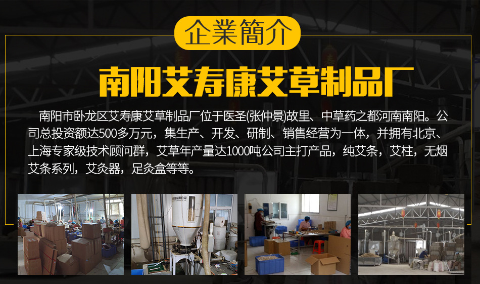 南阳市卧龙区艾寿康艾草制品厂位于医圣(张仲景)故里、中草药之都----河南南阳,是经国家正式批准的自主经营,专业从事天然艾草制品加工、销售、研发于一体的企业。公司自成立以来一直秉承“以人为本,以市场为导向,以技术为立足点,着力于为客户创造价值”的经营理念,秉承着“传承千年养生文化”的企业宗旨,专注于高品质艾草加工制作,公司致力发展艾草事业,打造艾草行业精品。立足中国,辐射全球,携手国内外同行弘扬中医传统文化,造福百姓。