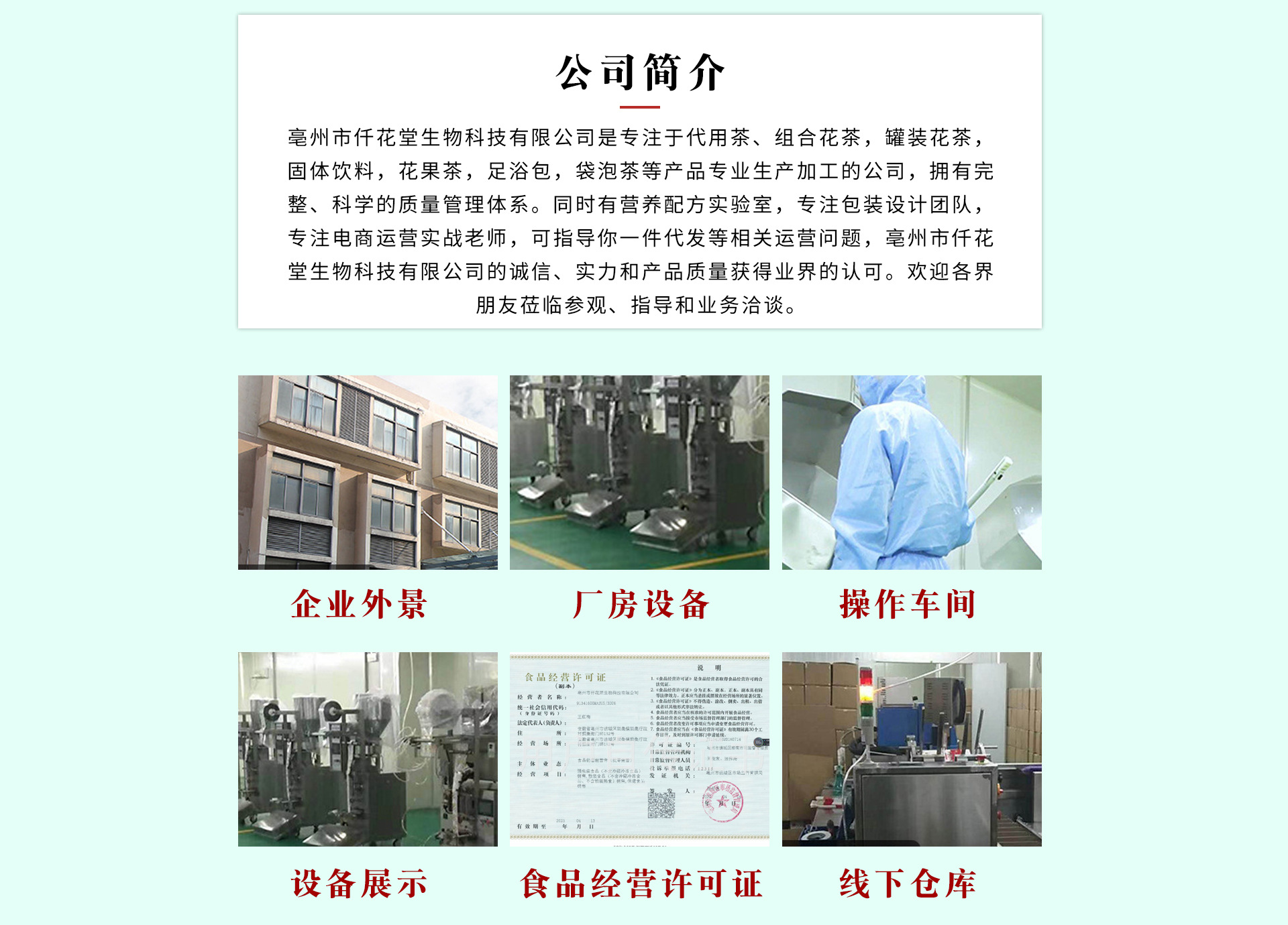 安徽仟花堂生物科技有限公司是专注于代用茶,组合花茶,罐装花茶,三角包,固体饮料,足浴包,袋泡茶等产品专业生产加工的公司,拥有完整,科学的质量管理体系。同时有营养配方的实验室,专注包装设计团队,专注电商运营实战老师,可指导你一件代发等相关运营问题,安徽茗方花源生物科技有限公司的诚信,实力和产品质量获得业界的认可。欢迎各界朋友莅临参观,指导和业务洽谈。