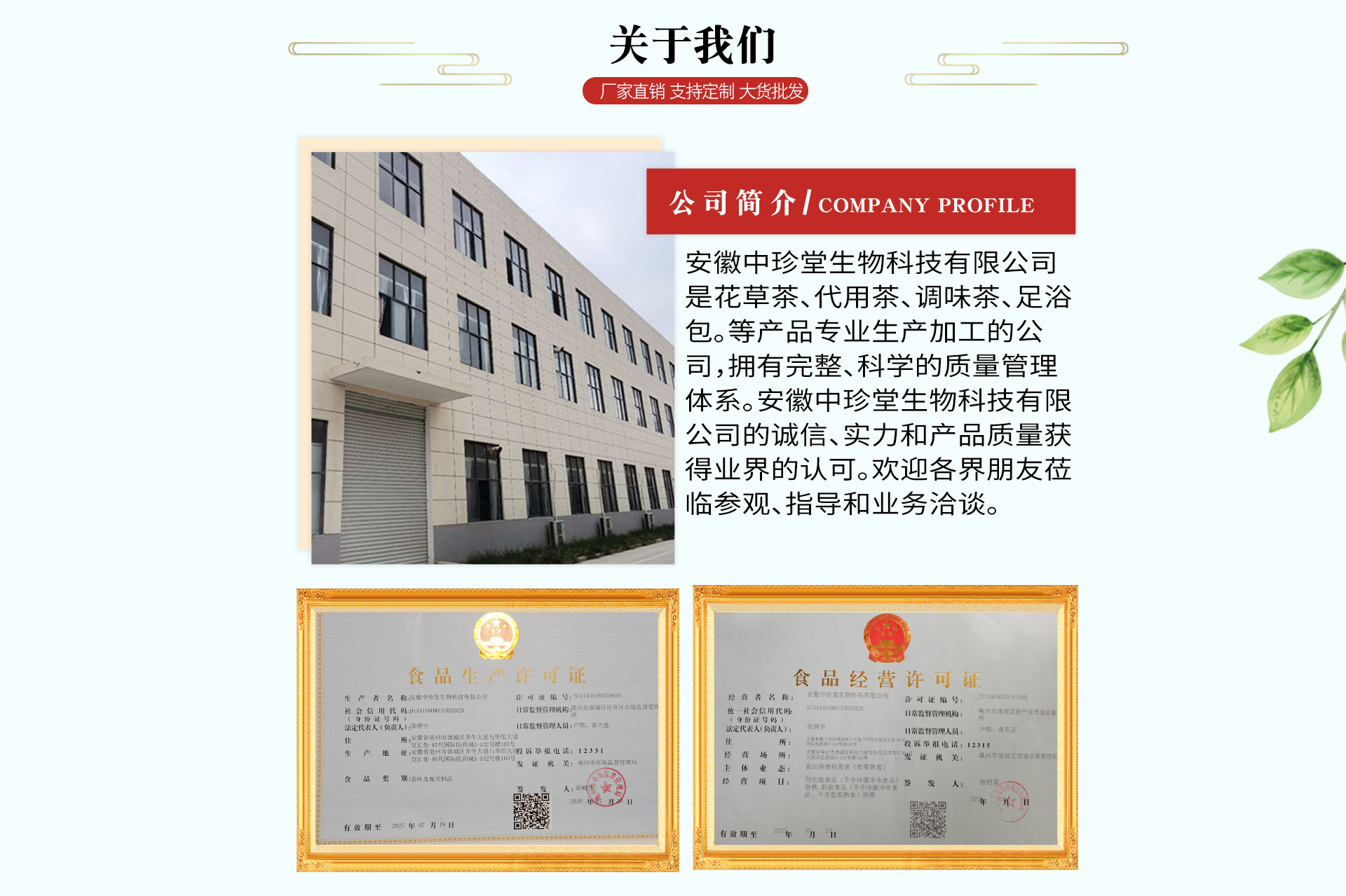 安徽中珍堂生物科技有限公司,2020年05月12日成立,经营范围包括从事生物科技领域内的技术开发、技术咨询、技术服务、技术推广,食品生产,食品销售,消毒产品生产及销售,足浴包生产及销售,农副产品购销。