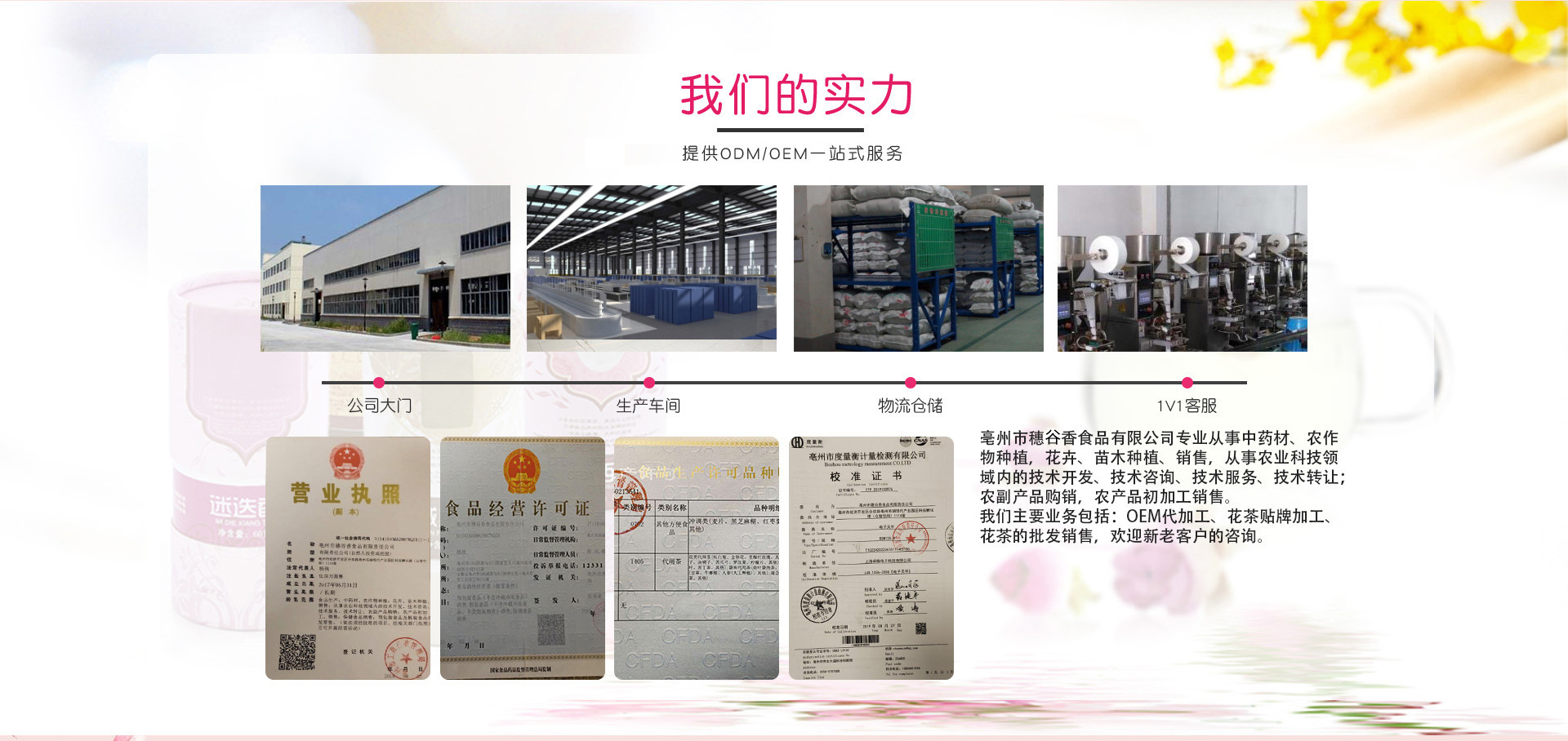 亳州市穗谷香食品有限责任公司是花茶、中药、滋补品等产品专业生产加工的公司,拥有完整、科学的质量管理体系。亳州市穗谷香食品有限责任公司的诚信、实力和产品质量获得业界的认可。欢迎各界朋友莅临参观、指导和业务洽谈。