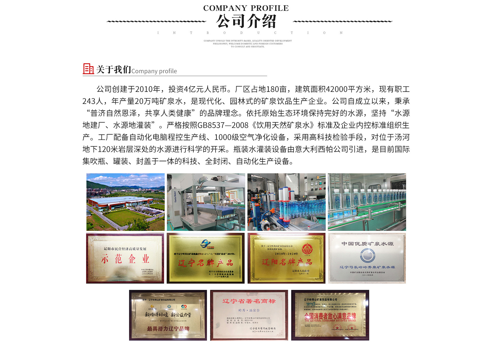 公司创建于2010年,投资4亿元人民币。厂区占地180亩,建筑面积42000平方米,现有职工243人,年产量20万吨优质矿泉水,是典型的环保型、现代化、园林式的矿泉饮品生产企业。公司自成立以来,秉承“普济自然恩泽,共享人类健康”的品牌理念。依托原始生态环境保持完好的天然水源,坚持“水源地建厂、水源地灌装”。严格按照GB8537—2008《饮用天然矿泉水》标准及企业内控标准组织生产。工厂配备自动化电脑程控生产线、1000级空气净化设备,采用精密的高科技检验手段,对位于汤河地下120米岩层深处的水源进行安全、科学的开采。瓶装水灌装设备由意大利西帕公司引进,是目前国际顶尖的集吹瓶、罐装、封盖于一体的高科技、全封闭、自动化生产设备。
