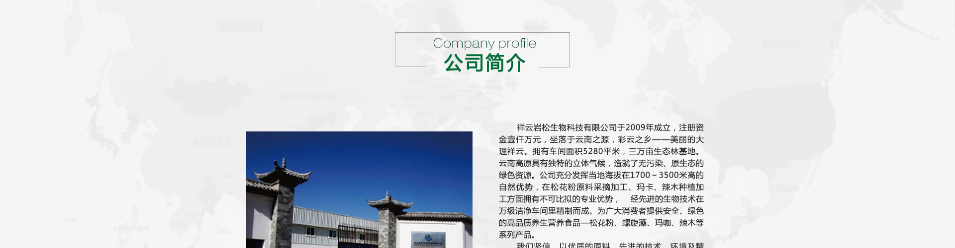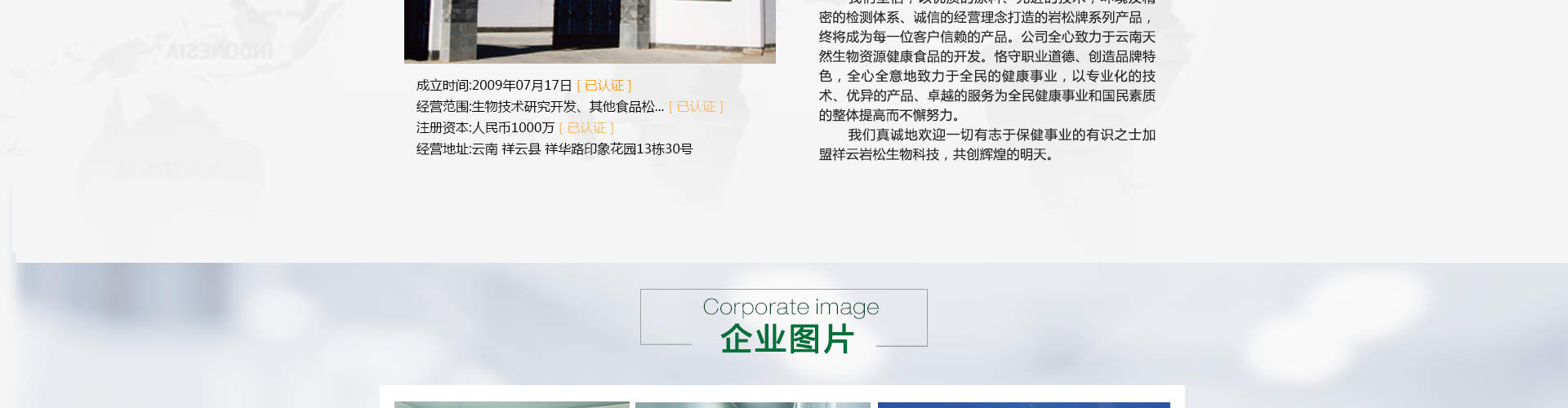 祥云岩松生物科技有限公司于2009年成立,注册资金壹仟万元,坐落于云南之源,彩云之乡——美丽的大理祥云。拥有车间面积2326平米,三万亩生态林基地。云南高原具有独特的立体气候,造就了无污染、原生态的绿色资源。公司充分发挥当地海拔在1700~3500米高的自然优势,在松花粉原料采摘加工、玛卡、辣木种植加工方面拥有不可比拟的专业优势, 经先进的生物技术在万级洁净车间里精制而成。为广大消费者提供安全、绿色的高品质养生营养食品—松花粉、螺旋藻、玛咖、辣木等系列产品。 我们坚信,以优质的原料、先进的技术,环境及精密的检测体系、诚信的经营理念打造的岩松牌系列产品,终将成为每一位客户信赖的产品。 公司全心致力于云南天然生物资源健康食品的开发。恪守职业道德、创造品牌特色,全心全意地致力于全民的健康事业,以专业化的技术、优异的产品、卓越的服务为全民健康事业和国民素质的整体提高而不懈努力。