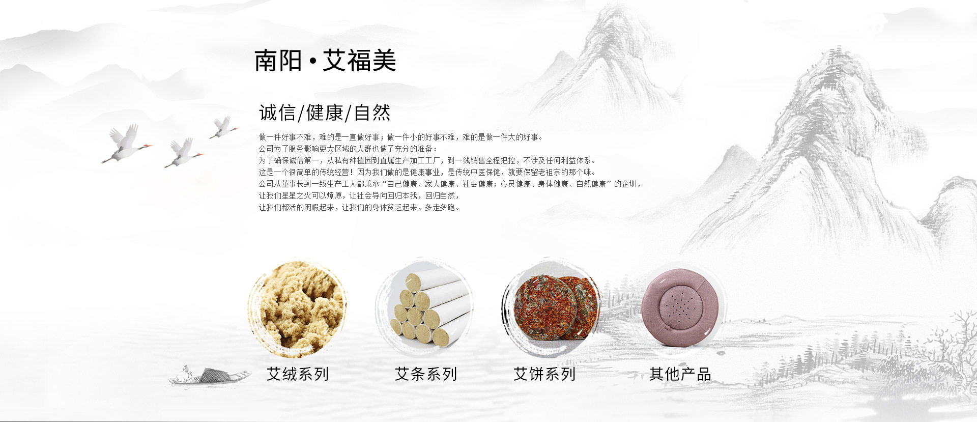 南阳艾福美艾草制品有限公司是艾绒,艾条,艾柱,艾叶饼,艾绒饼,艾灸器具,艾灸布艺等产品专业生产加工的公司,拥有完整的团队管理体系,高品质的产品质量,南阳艾福美艾草制品有限公司的诚信,实力和产品质量获得业界的认可。欢迎各界朋友莅临参观、指导和业务洽谈。