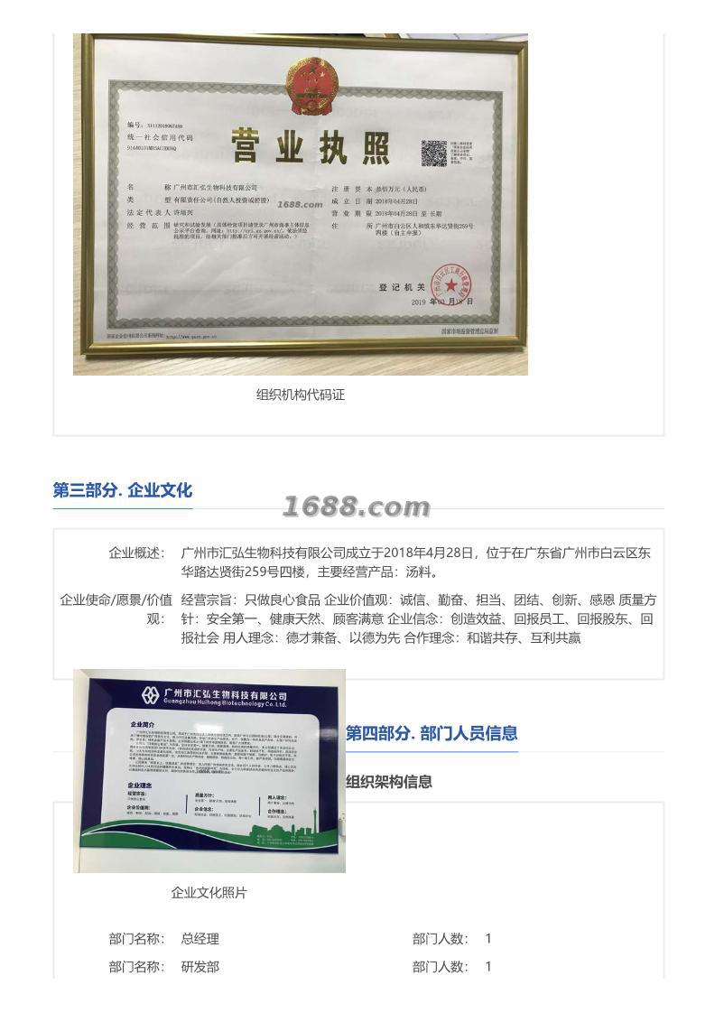 广州市汇弘生物科技有限公司,坐落于广州市白云区人和镇空港经济区内,距离广州白云国际机场5公里,陆空交通便利。传承了博大精深的广府养生文化,致力于打造集天然、传统广府养生产品研发、生产、销售为一体的食品产业链。主营广府传统汤料、养生茶、特色农副品干货等;公司将建立线上+线下的市场营销体系,服务广大消费者。 公司以“只做良心食品”为宗旨,坚持安全第一、健康天然、顾客满意、持续改进的质量方针,本公司通过了食品SC认证,拥有食品级洁净车间1300多平方米,2条自动化先进的分装、包装生产线。主要生产设备有:微波烘干灭菌机、14头全自动汤料定量包装机、全自动三角茶包包装机、高速破碎机、高效混合机等。主要检测设备有:智能恒温干燥箱、马弗炉、电子分析天平等。本公司坚持将食材的安全放在第一位,从原材料的产地对接、精挑筛选、到成品出品,每一道工序,都严格把控,为顾客提供安全、健康、放心的食品。 公司秉承“顾客
