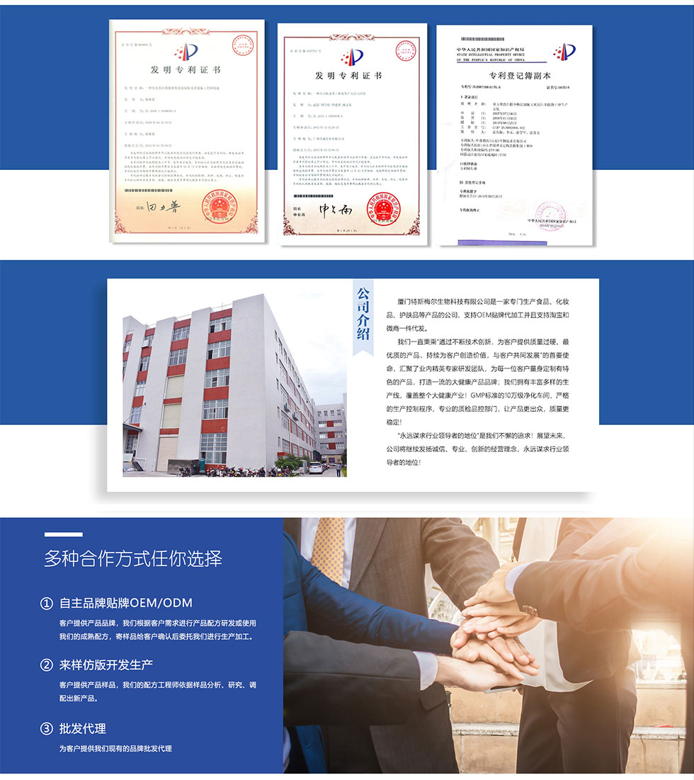 厦门特斯梅尔生物科技有限公司是隶属于特斯梅尔集团旗下一家分公司,是以研发、生产、加工大健康食品、化妆品、消毒品等为主体的公司。我们一直秉承“通过不断技术创新,为客户提供质量过硬、最优质的产品,持续为客户创造价值,与客户共同发展”的首要使命,汇聚了业内精英专家研发团队,为每一位客户量身定制有特色的产品,打造一流的大健康产品品牌。