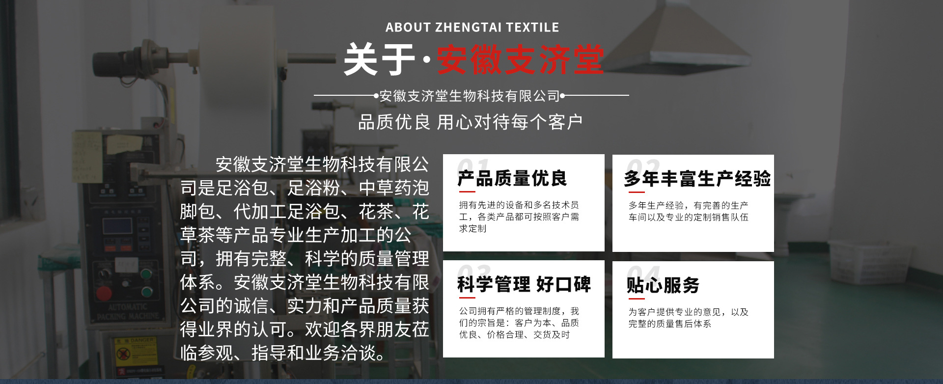 安徽支济堂生物科技有限公司是足浴包、足浴粉、中草药泡脚包、代加工足浴包、花茶、花草茶等产品专业生产加工的公司,拥有完整、科学的质量管理体系。安徽支济堂生物科技有限公司的诚信、实力和产品质量获得业界的认可。欢迎各界朋友莅临参观、指导和业务洽谈。
