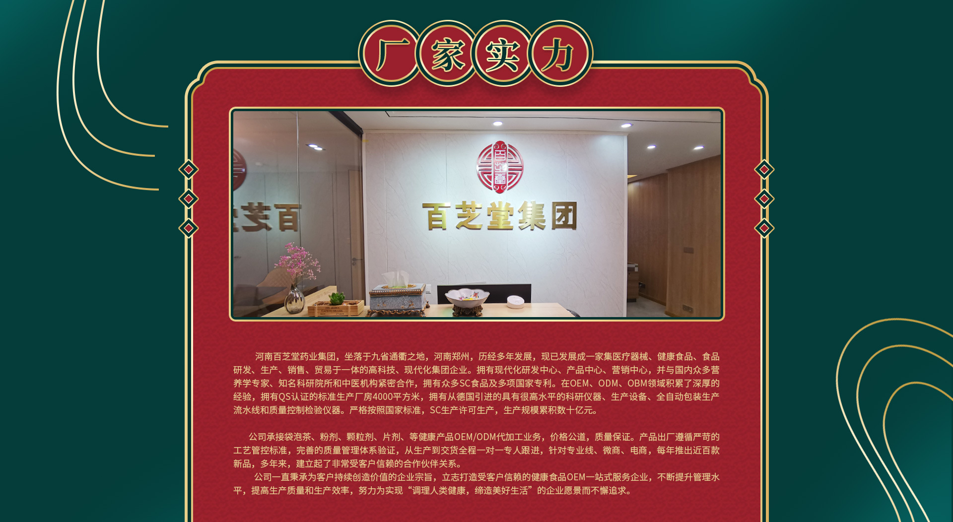 河南百芝堂药业集团有限公司,专业代工生产销售药食同源产品,集合研发,设计,调配,生产,销售一体的公司