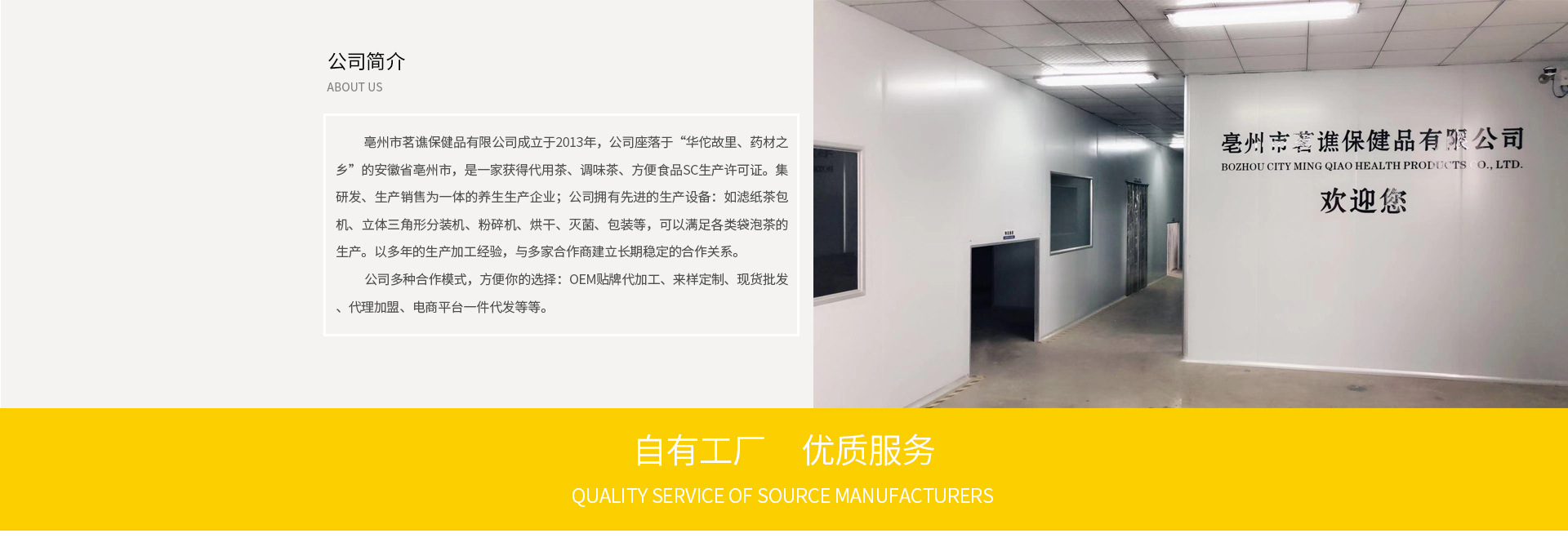 亳州市茗谯保健品有限公司创建于 2013 年,座落在素有“华佗故里、药材之乡”美誉的安徽省亳州市,公司已通过SC(QS)认证,公司品牌“茗谯茶品”已取得商标注册证,其产品体系分为以下几类:单品花草茶、花果茶、袋泡茶、复方茶等。经过多年的发展拥有标准厂房和办公场地1500平方米,全自动烘干设备、滤纸包装机、各种罐装包装机、尼龙三角包包装机、颗粒粉碎机、混合类八宝茶包装机等先进的代用茶生产设备可以完成各种花草茶的包装