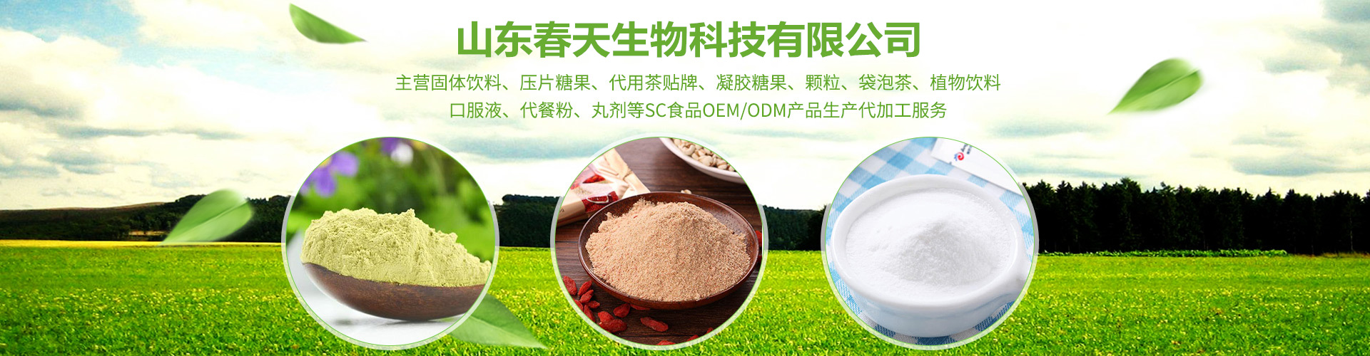 山东春天生物有限公司一直致力于固体饮料代加工、压片糖果代加工、代用茶代加工、凝胶糖果代加工、植物饮料代加工、新资源食品等产品的OEM贴牌代加工生产,公司拥有的生产技术和设备,具有完善的质量保证体系,从事生产加工,拥有完整质量管理体系。产品质量稳定可靠,供货能力强。秉着质量为先的理念,诚信经营的态度来回应客,让顾客满意是我们的动力。公司在长期的发展过程中以过硬的产品质量、良好的产品性能、过硬的技术建立了良好的合作信誉,我们也热诚欢迎潜在的客户来我司考察,参观及技术交流!