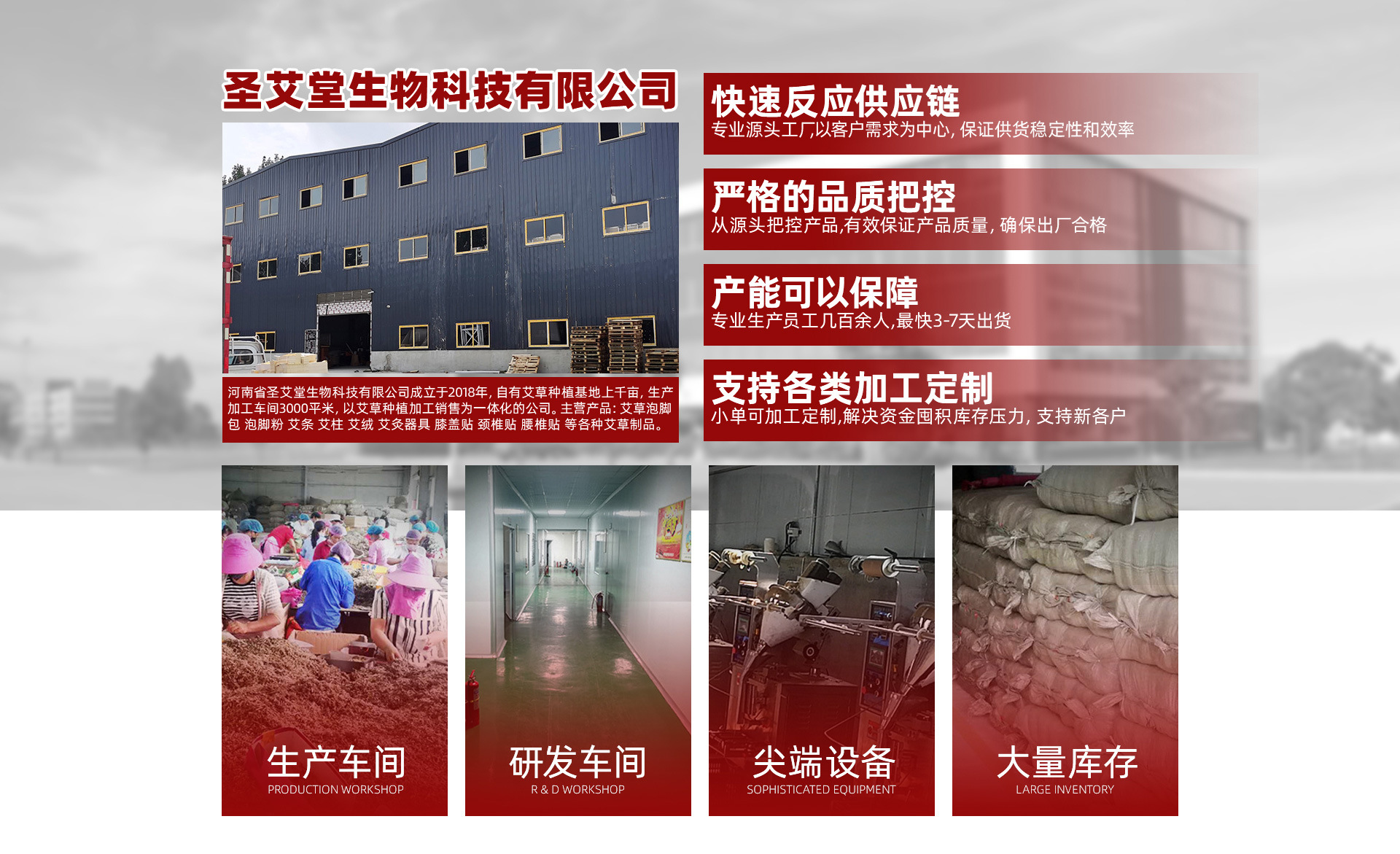 河南省圣艾堂生物科技有限公司成立于2018年,自由艾草种植基地上千亩,生产加工车间3000平米,以艾草种植加工销售为一体化的公司。主营产品:艾草泡脚包 泡脚粉 艾条 艾柱 艾绒 艾灸器具 膝盖贴 颈椎贴 腰椎贴 等各种艾草制品