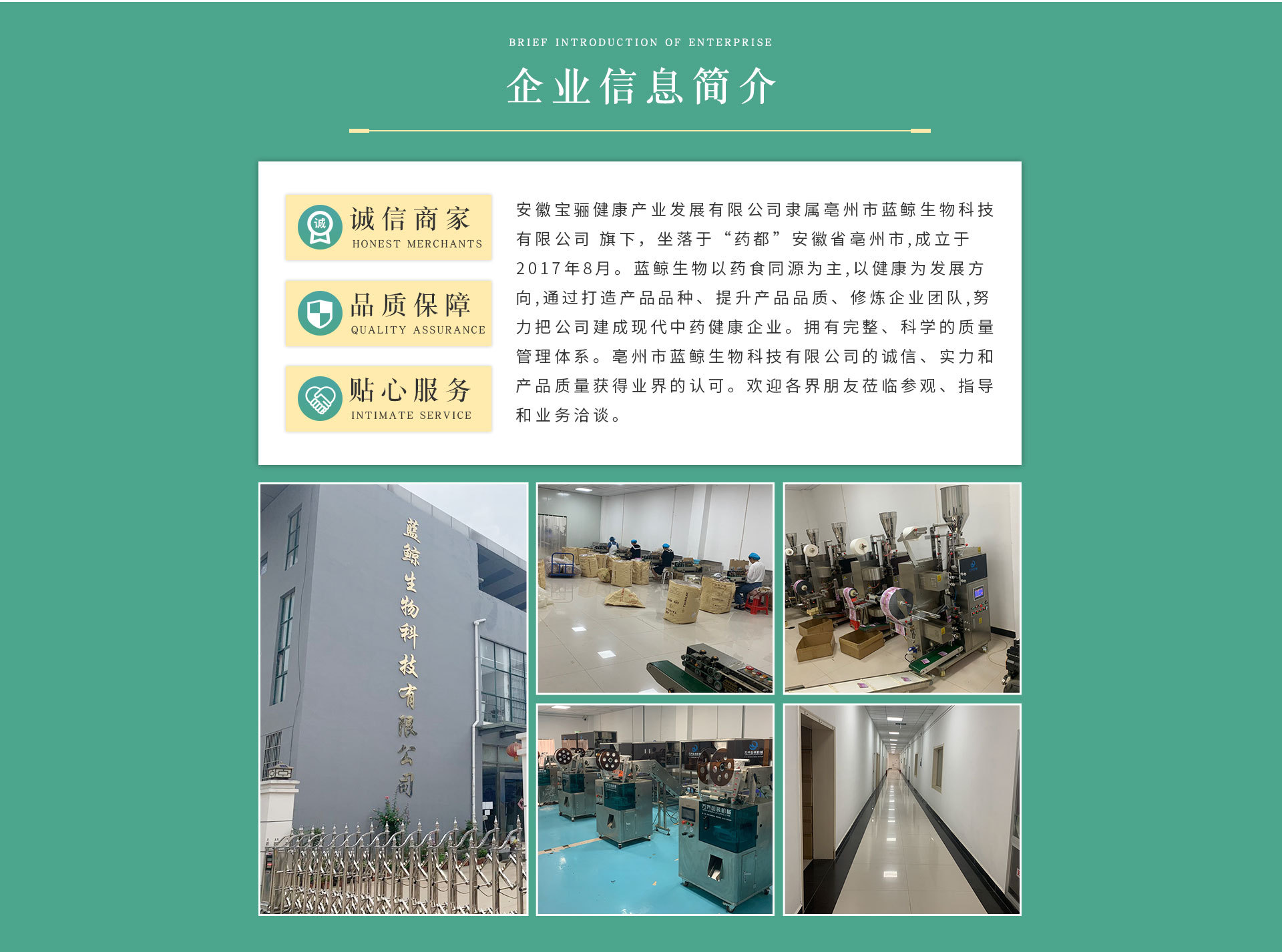 安徽宝骊健康产业发展有限公司隶属亳州市蓝鲸生物科技有限公司 旗下,坐落于“药都”安徽省亳州市,成立于2017年8月。蓝鲸生物以药食同源为主,以健康为发展方向,通过打造产品品种、提升产品品质、修炼企业团队,努力把公司建成现代中药健康企业。拥有完整、科学的质量管理体系。亳州市蓝鲸生物科技有限公司的诚信、实力和产品质量获得业界的认可。欢迎各界朋友莅临参观、指导和业务洽谈