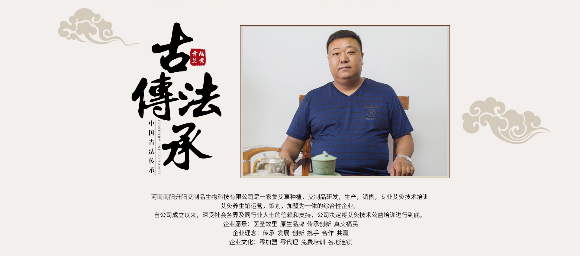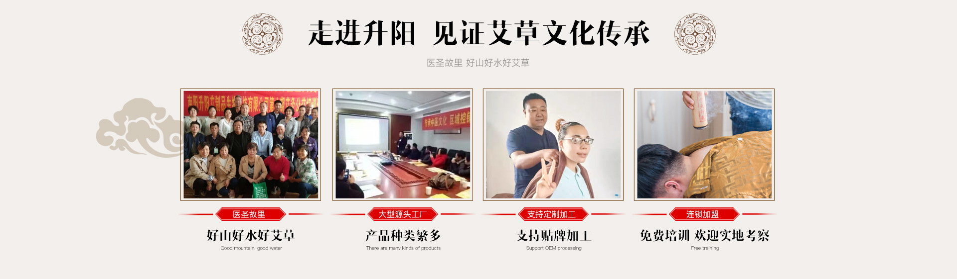 河南南阳升阳艾制品生物科技有限公司是一家集艾草种植,艾制品研发,生产,销售,专业艾灸技术培训,艾灸养生馆运营,策划,加盟为一体的综合性企业。 自公司成立以来,深受社会各界及同行业人士的信赖和支持,公司决定将艾灸技术公益培训进行到底。 企业愿景:医圣故里 原生品牌 传承创新 真艾福民 企业理念:传承 发展 创新 携手 合作 共赢 企业文化:零加盟 零代理 免费培训 全国连锁 企业宗旨:先为人 后为商 以诚相待 始道义 终诚信 创新进取
