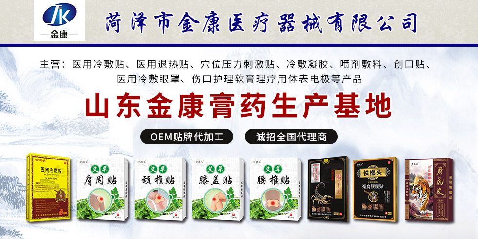 菏泽市金康医疗器械有限公司坐落于牡丹之城山东菏泽。是集研发、生产、销售为一体的综合性公司。菏泽市金康医疗器械拥有医用冷敷贴、医用退热贴、穴位压力刺激贴、冷敷凝胶、喷剂敷料、创口贴、医用冷敷眼罩、伤口护理软膏理疗用体表电极等产品批文,产品覆盖全国20多个省份,80多个城市。在传统医药文化基础上,结合高新技术生产工艺,生产拥有自主知识产权的各种新产品。能为人类健康作出贡献是我们持续不变的目标。