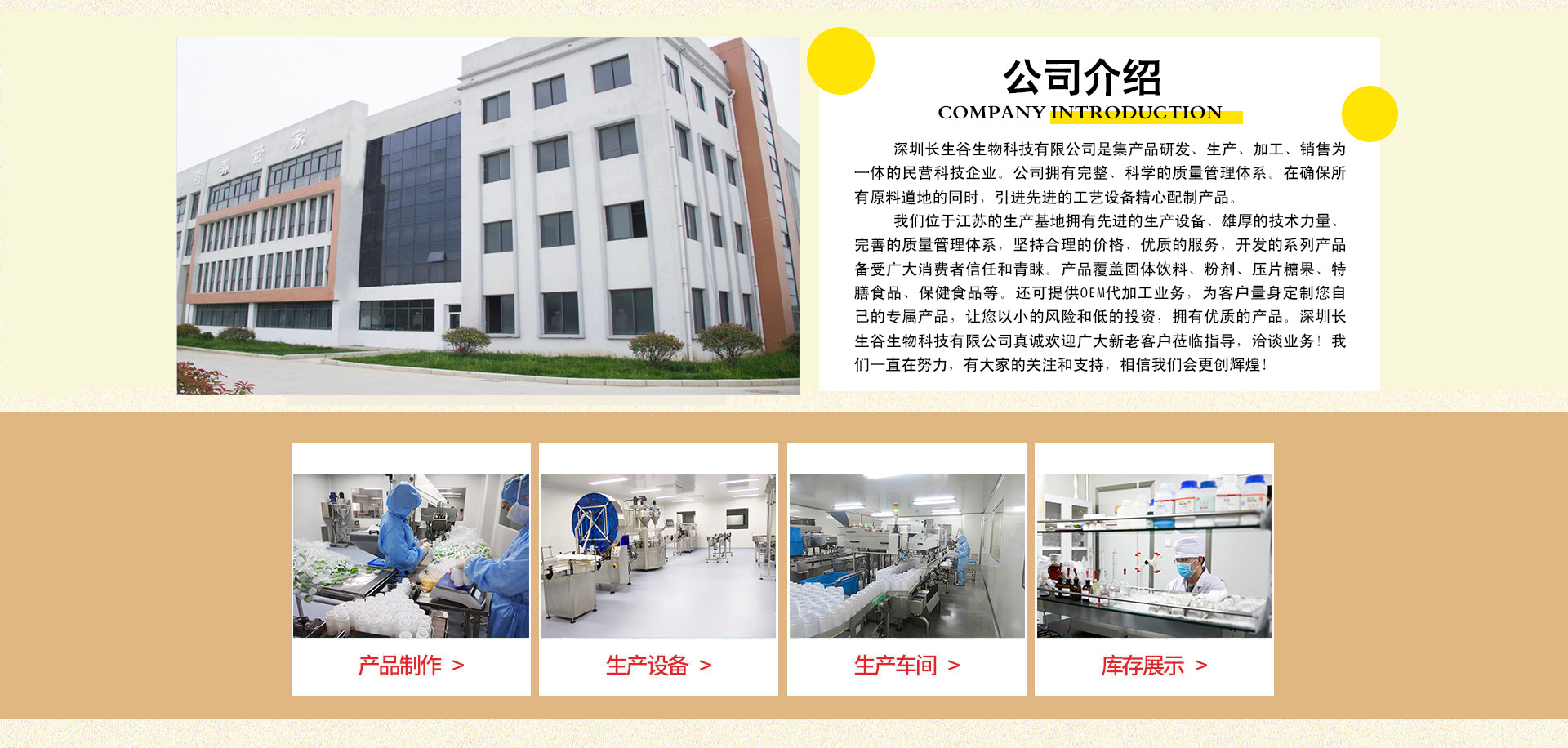 深圳长生谷生物科技有限公司是集产品研发、生产、加工、销售为一体的民营科技企业。公司拥有完整、科学的质量管理体系。在确保所有原料道地的同时,引进先进的工艺设备精心配制产品。我们位于江苏的生产基地拥有先进的生产设备、雄厚的技术力量、完善的质量管理体系,坚持合理的价格、优质的服务,开发的系列产品备受广大消费者信任和青睐。产品覆盖固体饮料、粉剂、压片糖果、特膳食品、保健食品等。还可提供OEM代加工业务,为客户量身定制您自己的专属产品,让您以小的风险和低的投资,拥有优质的产品。深圳长生谷生物科技有限公司真诚欢迎广大新老客户莅临指导,洽谈业务!我们一直在努力,有大家的关注和支持,相信我们会更创辉煌!