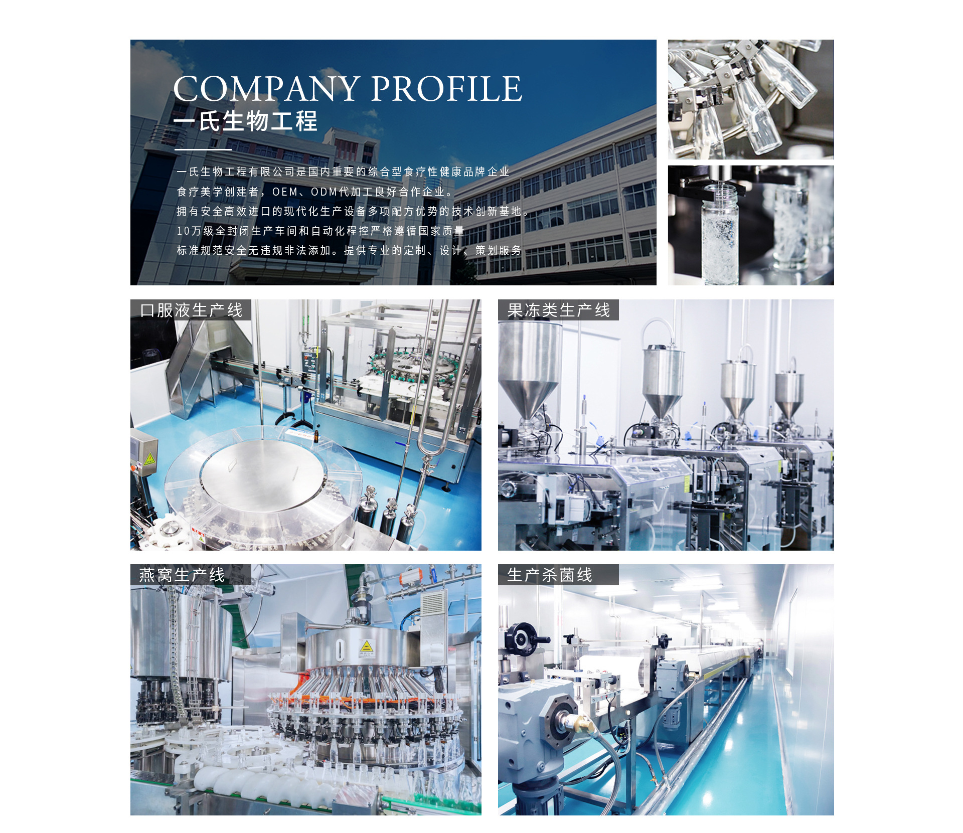 一氏国际(YEASI-INTERNATION)专注于食疗、养生及健康,注册于2010年;是国内专注研发、生产、销售为一体的综合型实业企业;企业营销中心位于经济特区厦门,生产基地位于漳州。 企业地址位于漳州龙文工业开发区横一路, 其厂区总共占地面积25亩,厂区配套办公楼、生产车间区、宿舍楼、食堂休闲区),2015年,公司正式入驻厂区并全面投产。 企业生产配有10万级的净化生产车间;生产线含概:固体饮料(胶原蛋白、咖啡、果饮)、系列花茶、代用茶、果冻(胶原蛋白果冻、益生元果冻、燕窝果冻)、蜜饯(洛神花、益生元果)、液体饮料(胶原口服液、益生元液)、压片糖果(玛卡含片、维生素含片)等项目;例配备果冻生产灌装线(30条)、固体饮料粉剂生产灌装线(8条)、蜜饯(10条)、花茶代用茶(1条)等专业生产线。 企业长期专注于人类健康以及新资源食品、食疗性产品的研发和生产,拥有专业的研发和销售团队;