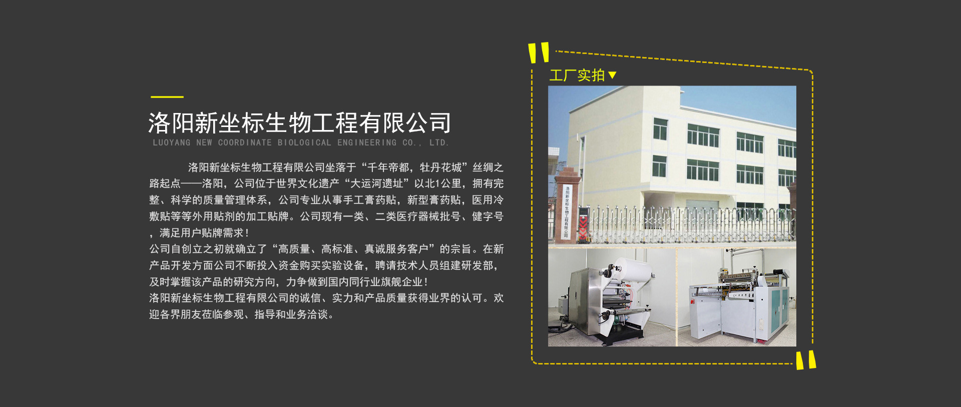 洛阳新坐标生物工程有限公司坐落于“千年帝都,牡丹花城”,丝绸之路起点——洛阳。拥有多年的历史,具有丰富的生产经验与先进的科学技术。专业从事膏药贴剂、喷剂、软膏、凝胶、粉剂的生产与加工。公司现有一类、二类医疗器械批号、健字号,满足用户贴牌需求,支持OEM/ODM贴牌加工,外用产品定制加工一站式服务