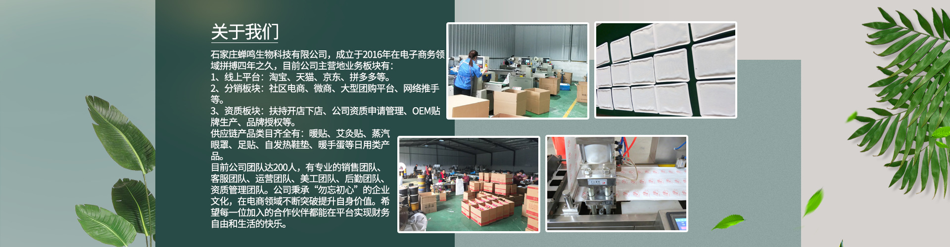 石家庄蝉鸣生物科技有限公司是一家从事保健产品和自发热产品、艾灸贴、蒸汽眼罩等产品研发、生产、销售于一体高科技企业,公司自有品牌“火火蝉”。 成立于2016年,支持OEM/ODM服务,可加工定制不同尺寸、型号的各类产品!公司依靠专业的研发生产技术为客户提供品质优良、性价比更高的产品和更快速周到的服务,与多家生产厂家建立了良好的合作关系,日产暖贴100万贴以上,深受国内外客户好评。产品远销香港、台湾、澳大利亚、美国、英国、俄罗斯、日本、韩国等多个国家地区。