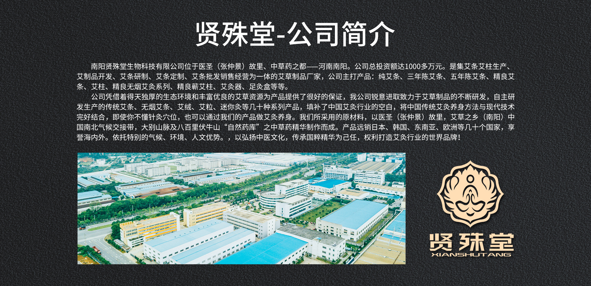 南阳贤殊堂艾草制品有限公司位于医圣(张伸景)故里、中草药之都----河南南阳。公司总投资额达1000多万元,是集艾条艾柱生产、艾制品开发、艾条研制、艾条定制、艾条批发销售经营为一体的艾条厂家,公司主打产品,纯艾条,三年陈艾条,五年陈艾条,精品艾条,艾柱,精品无烟艾条系列,精品薪艾柱,艾灸器,足灸盒等等,素有“艾草之乡”之称。 公司凭借着得天独厚的生态环境和丰富优质的艾草资源为产品提供了最优质的保证,我公司锐意进取致力于艾草制品的不断研发,自主研发生产的传统艾条,无烟艾条,艾绒、艾粒、迷你灸等近几十种系列产品,填补了中国艾灸行业的空白,将中国传统艾灸养生秘方与现代技术完美结合,即使你不懂针灸穴位,也可以通过我们的产品做艾灸养生。我们所采用的原材料,以精选医圣(张仲景)故里,药材之都(南阳)中国南北气候交接带,大别山脉及八百里伏牛山“天然药库”之中草药精华精制而成。