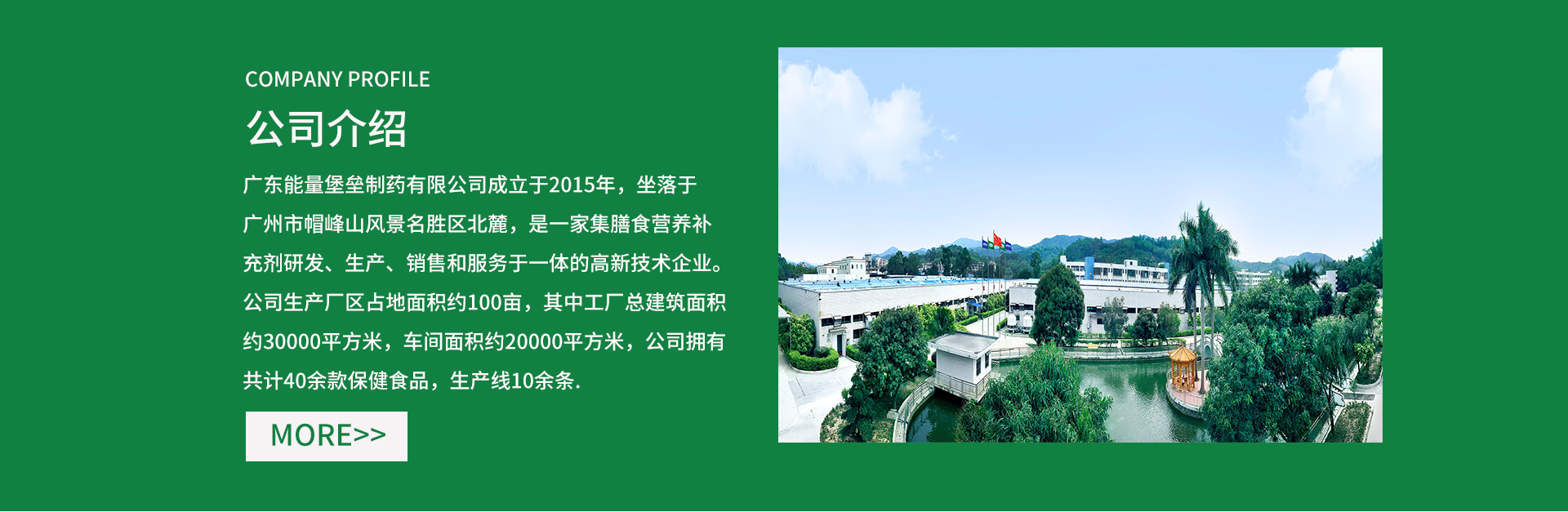 广东能量堡垒制药有限公司(以下简称能量堡垒)成立于2015年,坐落于广州市帽峰山风景名胜区北麓,是一家集膳食营养补充剂研发、生产、销售和服务于一体的高新技术企业。 公司生产厂区占地面积约100亩,其中工厂总建筑面积约30000平方米,车间面积约20000平方米,公司拥有共计40余款保健食品,生产线10余条