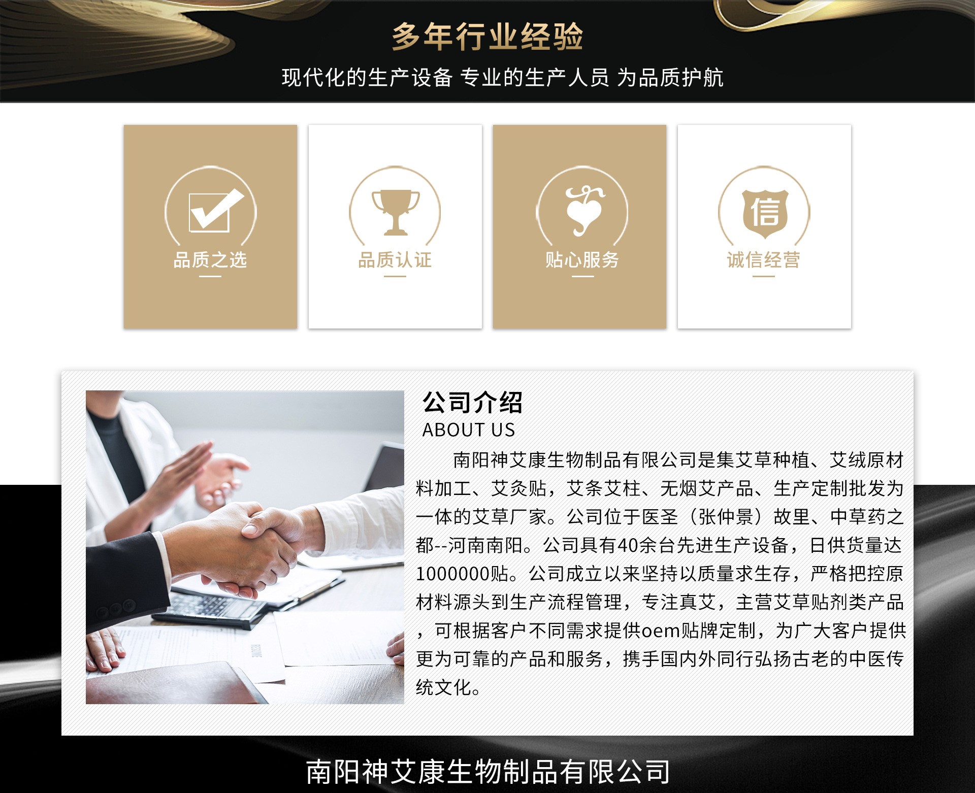 南阳神艾康生物制品有限公司是艾灸、艾草等产品专业生产加工的公司,拥有完整、科学的质量管理体系。南阳神艾康生物制品有限公司的诚信、实力和产品质量获得业界的认可。欢迎各界朋友莅临参观、指导和业务洽谈。