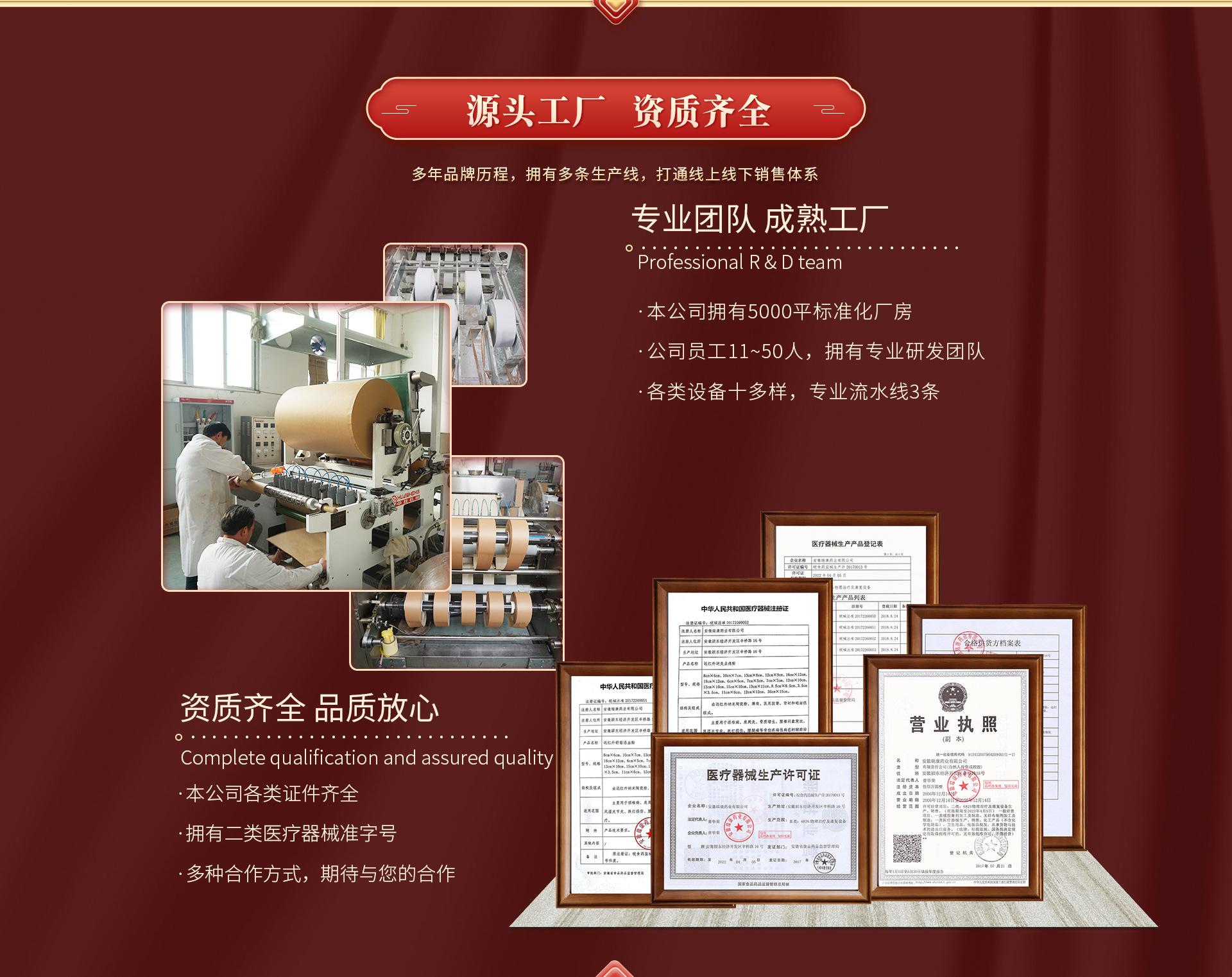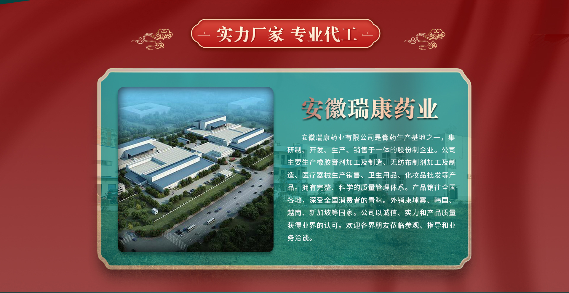 安徽瑞康药业有限公司是膏药生产基地之一,集研制、开发、生产、销售于一体的股份制企业。公司主要生产有:医疗器械类(远红外系列贴剂、自行发热贴系列)、卫生用品类等。产品销往全国各地,深受全国消费者的青睐。外销柬埔寨、韩国、越南、新加坡等国家。随着中国中医药学科技的发展,近年来,公司在不断改革创新,严格按照生产工艺、科学配方。坚持发扬“同心、开拓、求实、高效”的企业精神。明确实事求是、稳步增长的企业发展思路。在全体职工的共同努力下,积极开拓、不断进取,现已发展成为具有现代化专业流水线生产二类医疗器械(远红外贴剂)的企业。 安徽瑞康药业有限公司是橡胶膏剂加工及制造、无纺布制剂加工及制造、医疗器械生产销售、卫生用品、化妆品批发等产品专业生产加工的公司,拥有完整、科学的质量管理体系。 安徽瑞康药业有限公司的诚信、实力和产品质量获得业界的认可。欢迎各界朋友莅临参观、指导和业务洽谈。