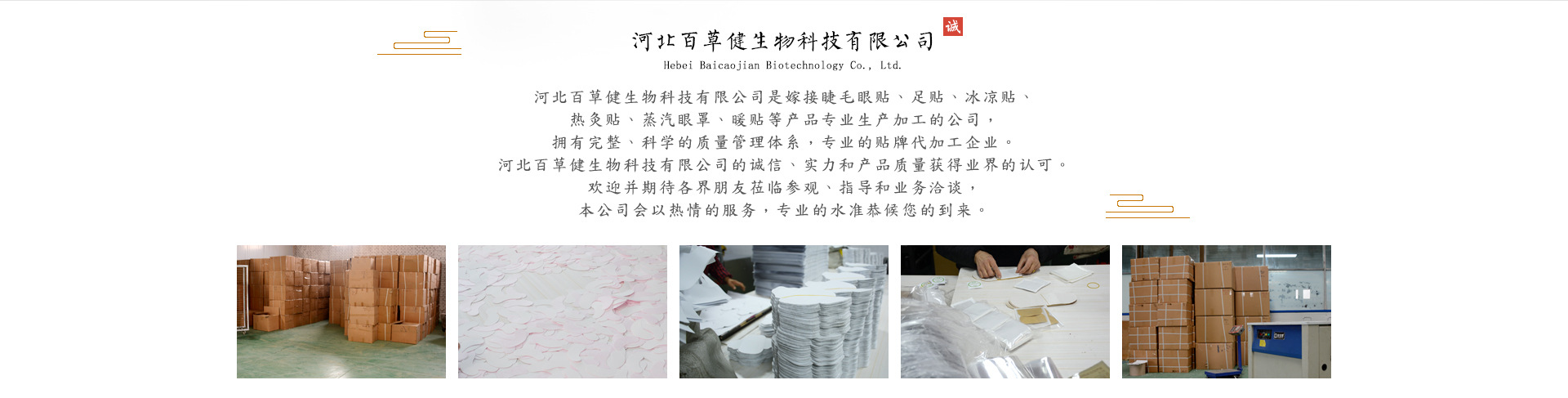 河北百草健生物科技有限公司是嫁接睫毛眼贴、足贴、冰凉贴、热灸贴、蒸汽眼罩、暖贴等产品专业生产加工的公司,拥有完整、科学的质量管理体系,专业的贴牌代加工企业。河北百草健生物科技有限公司的诚信、实力和产品质量获得业界的认可。欢迎并期待各界朋友莅临参观、指导和业务洽谈,本公司会以热情的服务,专业的水准恭候您的到来。