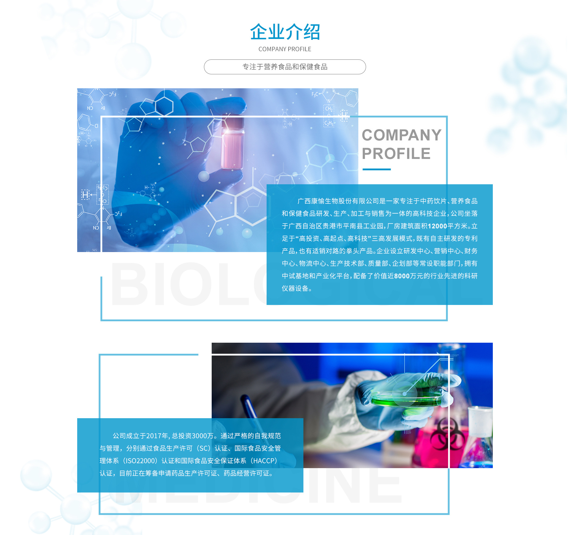 广西康愉生物股份有限公司成立于2017-09-04,法定代表人为谢海林,注册资本为500万元人民币,统一社会信用代码为91450800MA5LC64N0P。企业地址位于贵港市平南县工业园(地块A)农民工创业园内第五栋,所属行业为制造业,经营范围包含:生物医药技术和生物医药制品开发、技术转让、咨询;预包装食品、保健食品、药品、化妆品、护肤品、卫生用品、医药用品、医疗器械、固体饮料、糖果、巧克力、代用茶、乳制品、发酵制品、特殊医学用途配方食品、方便食品、中药提取物、中药饮片生产、销售及网上销售;食品原料、中药原材料、农副产品加工、销售;商品信息咨询;商品进出口贸易;医学互联网信息服务;中药材种植;劳保用品的研究、设计、制造及销售;纺织品、医用防护服及防护用品制造、销售。