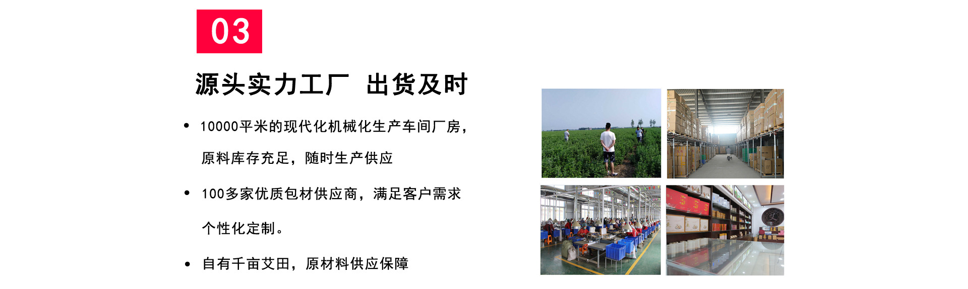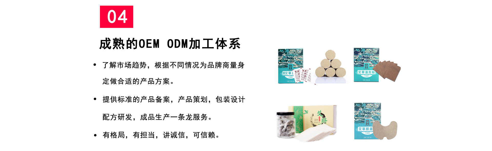 南阳市艾兴堂艾草制品有限公司是⼀家专业从事艾草种植、产品研 发、艾绒原材料加⼯、艾条⽣产、艾灸类器具贴剂粉剂研制开发、艾条批发、艾 柱、艾饼、艾条OEN定制、⽣产、制造、线上线下艾草制品的OEM加⼯、 贴牌加⼯、定制加⼯等、经营贸易,以及艾灸诊疗与教学研究为⼀体的多 功能、复合式、专业化企业。 现公司拥有两个野⽣艾草直供基地,⼀个⼤型⽆尘艾绒提取⻋间,数 万平专业艾草陈放仓库,⼀个⾃动化艾条卷制⻋间,并有肩颈贴膝盖贴等贴剂 产包装⻋间、肚脐贴药丸产⻋间产品⽣产制造基地,以及强⼤的营销⽹ 络、完善的终端连锁服务体系。