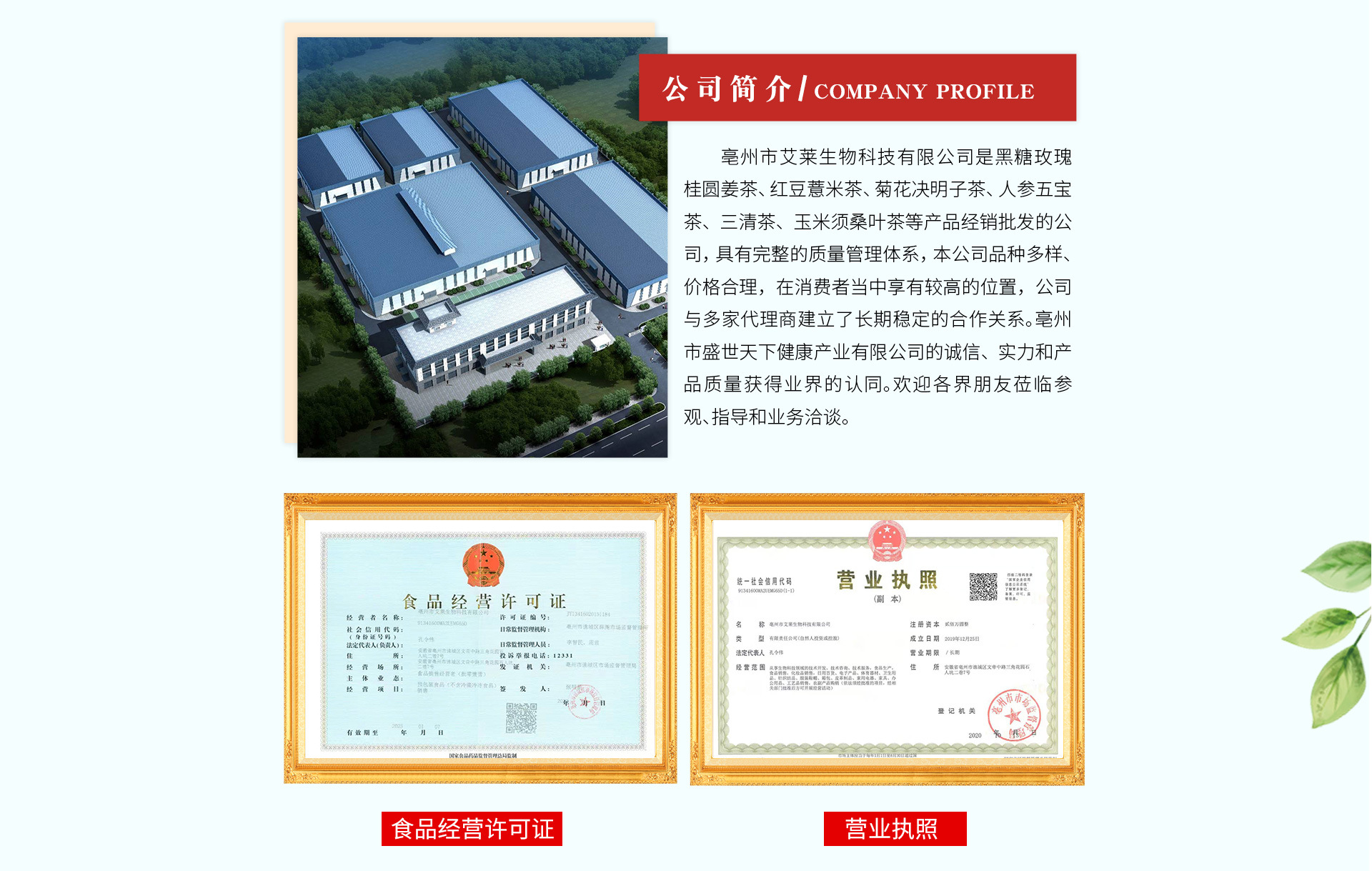 亳州艾莱生物科技有限公司 常年供应 各种组合袋撕茶、配方养生茶 桂圆红枣枸杞茶、人参五宝茶、菊花决明子茶、八宝茶、胖大海菊花茶、菊花罗汉果茶、菊苣栀子茶、口气清新茶等,各种产品均有现货批发,支持OEM贴牌定制,配料,净含量,包装均可自由调整,只需提供营业执照免费设计产品包装,调试产品配方口感! 源头厂家实力出品,品质保障,服务贴心、生产稳定,出货快速。活动不断几乎全年包邮适合分销! 关于贴牌代工:每盒装10小包每包10-15克,配料可自行更改包装可自行更改也可以用我们做的通用盒子只需要做一张标签贴上即可.