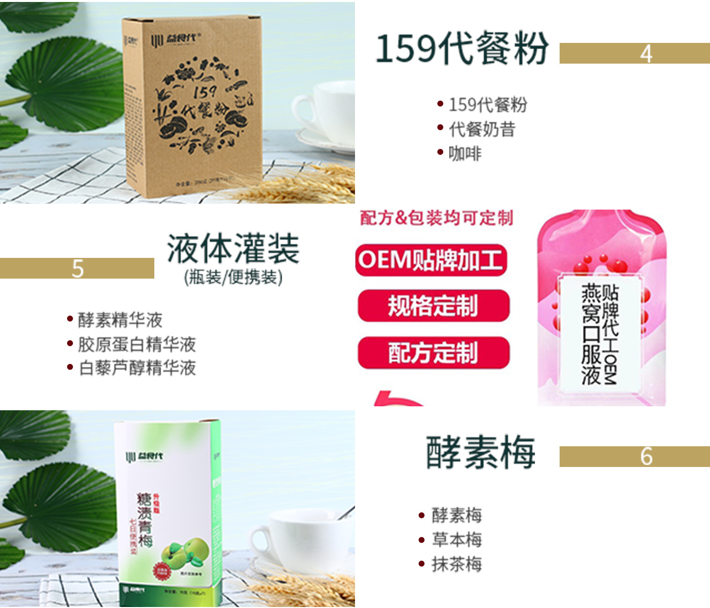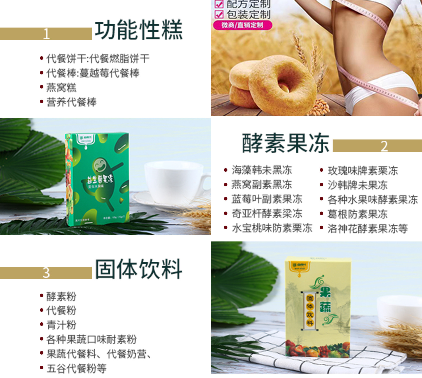 青梅OEM代工;海藻冻贴牌;代餐饼干加工;代餐果冻定制加工;酵素果冻;酵素粉;酵素梅;代餐口酥、曲奇;酵素原液;金枪鱼多肽饮料;膳食纤维果冻;益生元果冻;奇亚籽代餐饼干;燕麦代餐海藻饼干;燕窝代餐果冻;胶原蛋白果冻;美白含片