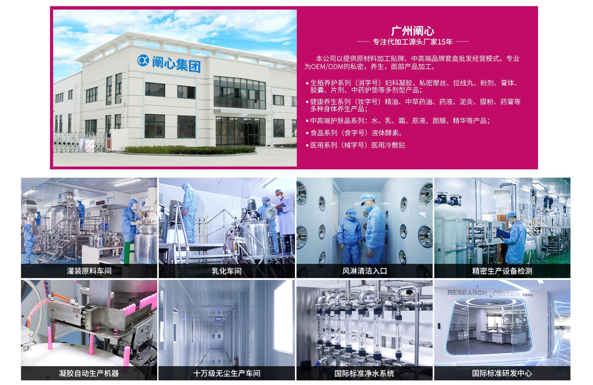 广州阐心生物科技有限公司是广州阐心控股有限公司旗下全资子公司。 阐心控股一家集研发、生产、销售、培训、策划为一体的大型健康企业集团,产品涵盖美容护肤产品、健康养生产品、生殖养护产品、保健食品。 广州消字号工厂,支持实地验厂拥有一流的研发团队、一流的生产环境、一流的生产设备,可日产30万支妇科凝胶、300万粒私密胶囊、美容套盒10万套、软管3万支、玻璃瓶8万支、安瓶25万支、面膜100万片。集团主营产品有:生殖养护系列:妇科凝胶、私密摩丝、拉线丸、粉剂、膏体、胶囊、片剂、中药护垫等多剂型产品;健康养生系列:精油、中草药油、药液、泥灸、膜粉、药膏等多种身体养生产品;中高端护肤品系列:水、乳、霜、原液、面膜、精华等产品;食品系列:液体酵素。 热诚欢迎微商、电商、分销、直销、连锁、实体客户前来洽谈合作,上万种产品,任您挑选!